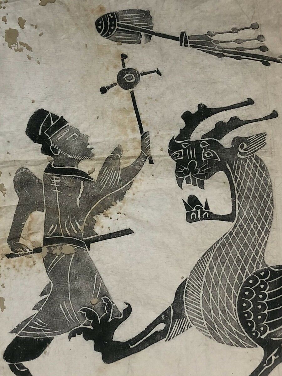 យោងតាមការស្រាវជ្រាវ ចំពោះប្រវត្តិមួយក្នុងចំណោមប្រវត្តិ ៤ នៃការកើតឡើងរបាំម៉ុងសាយ កាលពីព្រេងនាយមានរឿងដំណាលថា កាលពីរាប់រយឆ្នាំមកហើយ មានភូមិតូចមួយត្រូវគំរាមកំហែងនៅថ្ងៃចូលឆ្នាំថ្មី ដោយក្រុមចោរព្រៃដែលតែងខ្លួនជាសត្វព្រៃចម្លែកៗ។ ក្រុមចោរបានបន្លាចប្រជាជនឲ្យរត់ចេញពីផ្ទះ និងលួចរបស់របរ ព្រមទាំងដីស្រែចម្ការពួកគេផងដែរ។ ដោយសារអត់ឃ្លាន អ្នកភូមិក៏បានងើបឈរប្រឆាំងនឹងក្រុមចោរព្រៃមិនស្គាល់មុខនោះ និងបានបង្កើតសម្លៀកបំពាក់ក្លែងក្លាយមួយដែលតំណាងឲ្យម៉ុងសាយ (សិង្ហ ឬ តោ) រហូតក្លាយជាប្រពៃណីតរៀងមក៕