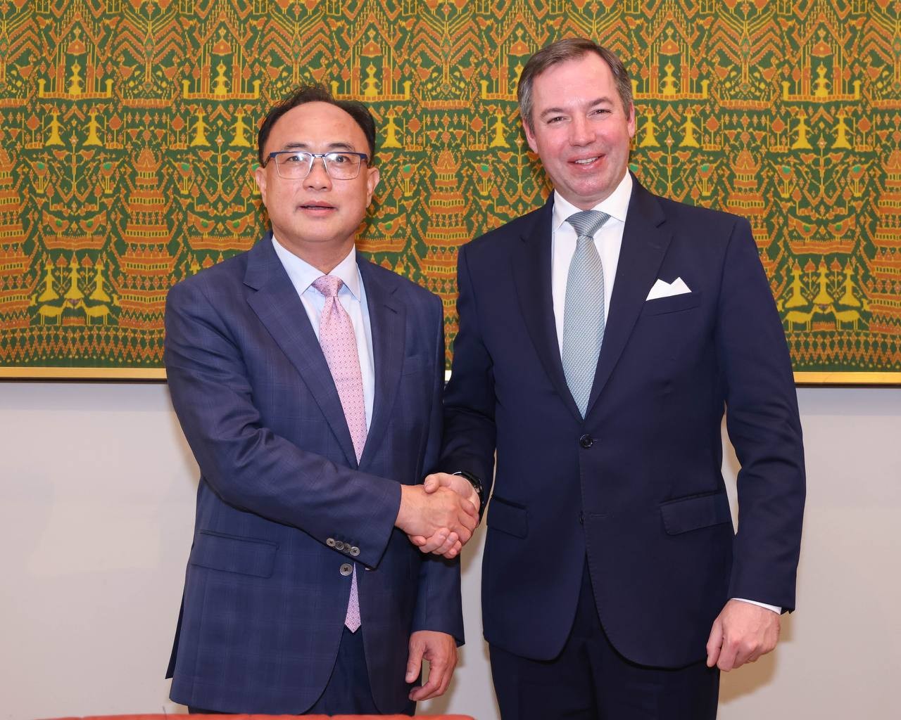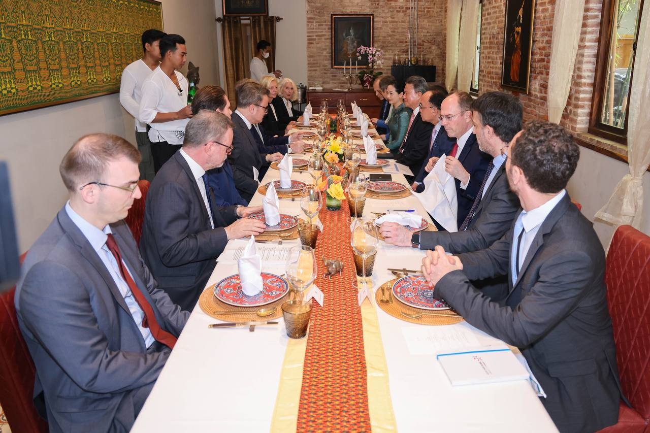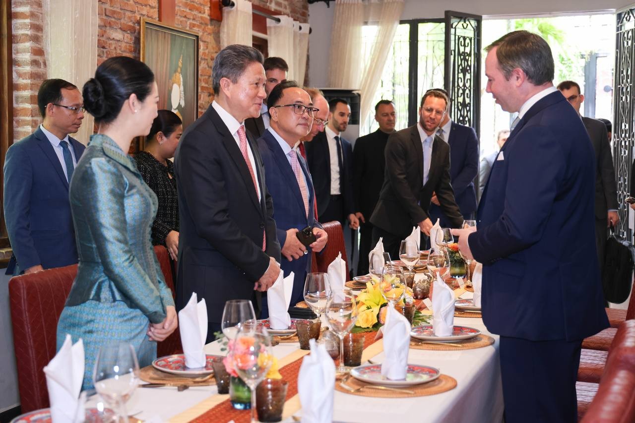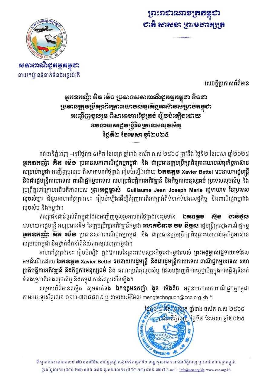 ភ្នំពេញ៖ នៅថ្ងៃទី២ ខែមេសា ឆ្នាំ២០២៥ អ្នកឧកញ៉ា គិត ម៉េង ប្រធានសភាពាណិជ្ជកម្មកម្ពុជា និងជាប្រធានក្រុមប្រឹក្សាពិគ្រោះយោបល់ធុរកិច្ចអាស៊ានសម្រាប់កម្ពុជា អញ្ជើញចូលរួមពិសាអាហារថ្ងៃត្រង់ រៀបចំឡើងដោយឯកឧត្តម Xavier Bettel ឧបនាយករដ្ឋមន្រ្ដី និងជារដ្ឋមន្រ្ដីការបរទេស ពាណិជ្ជកម្មបរទេស សហប្រតិបត្តិការអភិវឌ្ឍន៍ និងកិច្ចការមនុស្សធម៌ ប្រទេសលុចសំបួ និងប្រព្រឹត្តទៅក្រោមអធិបតីភាពរបស់ព្រះអង្គម្ចាស់ Guillaume Jean Joseph Marie រជ្ជទាយាទនៃប្រទេសលុចសំបួ។