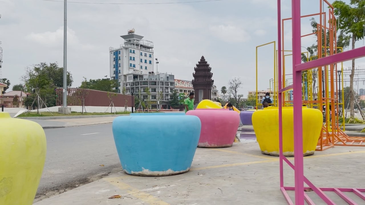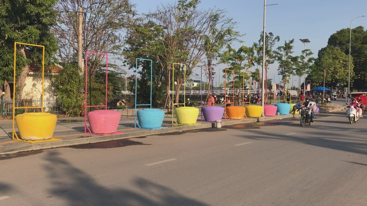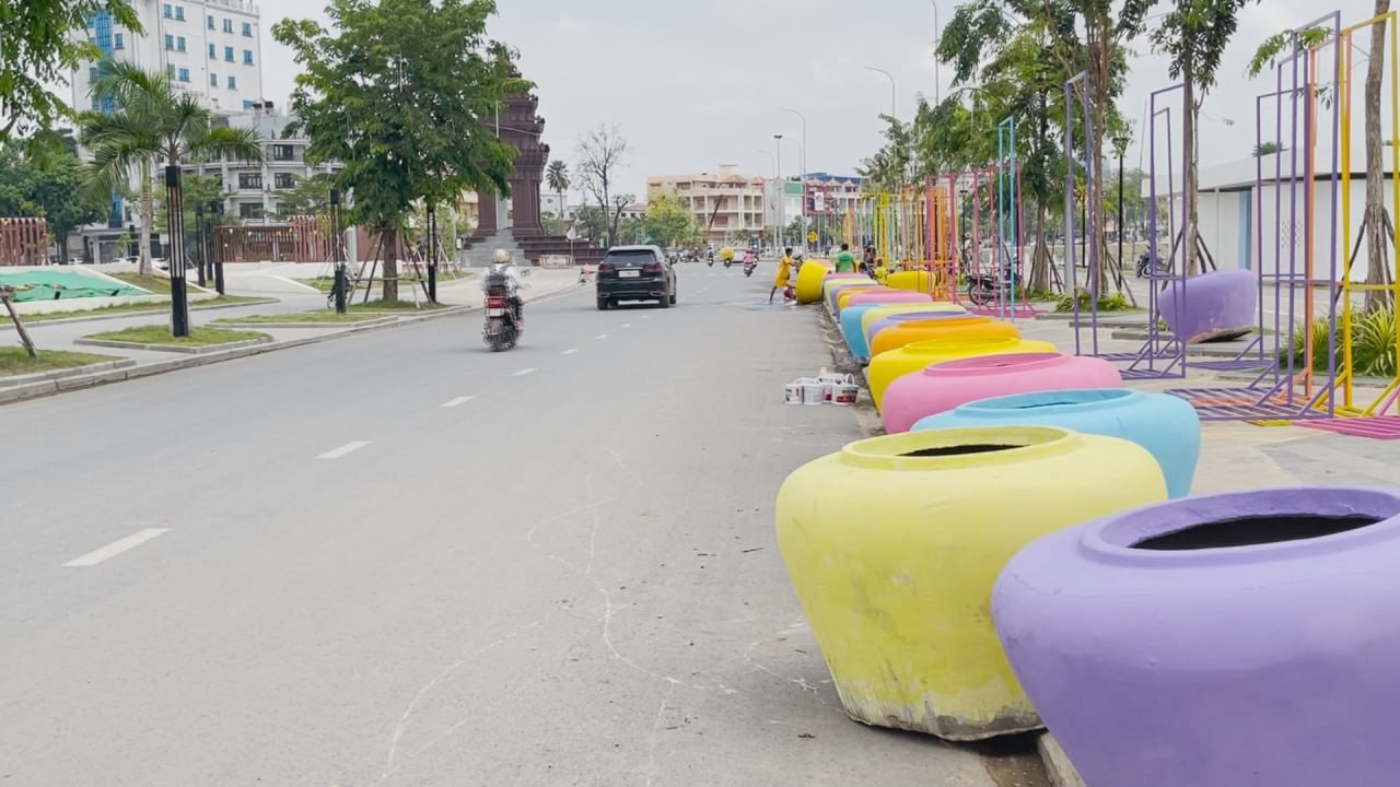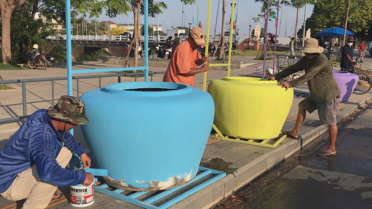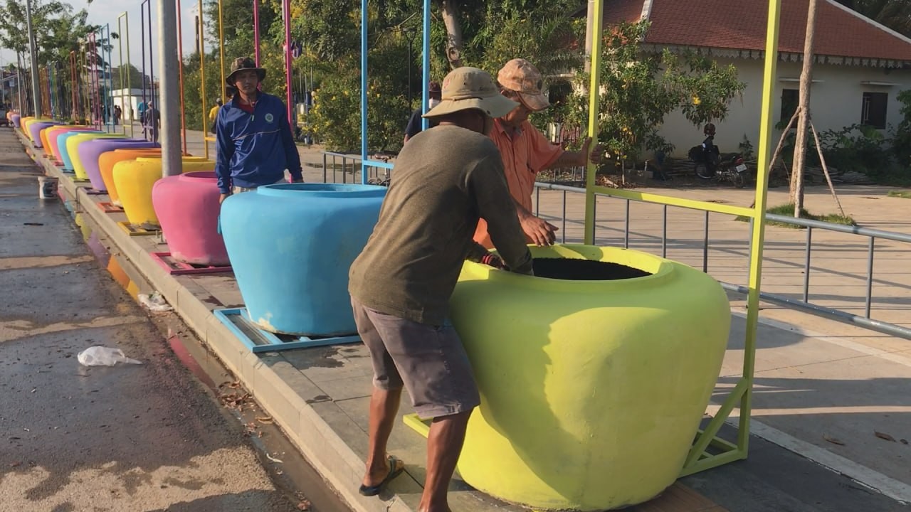 ពាងទឹកចម្រុះពណ៌ជាច្រើន ត្រូវបានដឹកយកមកដាក់នៅតំបន់ត្រជាក់ចិត្ត ត្រៀមការលេងកម្សាន្តក្នុងការបើកព្រឹត្តិការណ៍សង្រ្កាន្តបាត់ដំបង