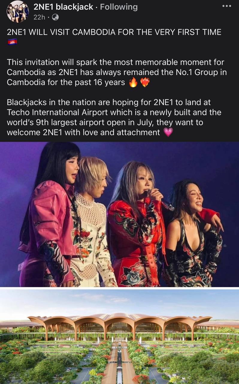 បន្ថែមពីនេះ ទំព័រហ្វេសប៊ុកមួយឈ្មោះ 2NE1 blackjack បានបង្ហោះសំណេរថា ការអញ្ជើញនេះ នឹងជំរុញឱ្យមានការចងចាំដ៏អស្ចារ្យបំផុតសម្រាប់ប្រទេសកម្ពុជា ខណៈក្រុម 2NE1 តែងតែនៅតែជាក្រុមលេខ ១ នៅកម្ពុជាអស់រយៈពេល ១៦ ឆ្នាំមកហើយ ៕