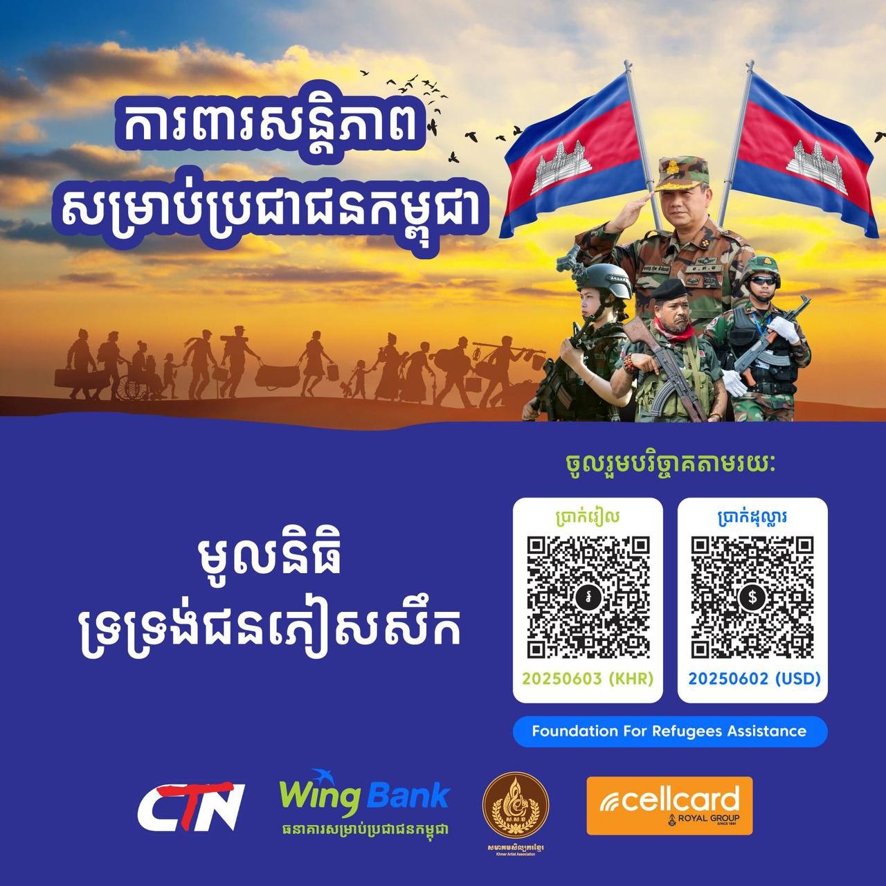 គួររំលឹកថា តបតាមការអំពាវនាវពីសំណាក់សម្តេចតេជោ ហ៊ុន សែន ប្រធានព្រឹទ្ធសភានៃព្រះរាជាណាចក្រកម្ពុជា, មូលនិធិ ទ្រទ្រង់ជនភៀសសឹក ក្រោមកិច្ចសហការរវាងសមាគមសិល្បករខ្មែរ, ក្រុមហ៊ុន សែលខាត, ធនាគារ វីង និងក្រុមហ៊ុន CBS បានចាប់ផ្តើម ដំណាក់កាលទី២ ដើម្បីកៀរគរថវិកាជួយដល់កងទ័ពដែលកំពុងឈរជើងការពារដែនអធិបតេយ្យភាពជាតិនៅតាមបន្ទាត់ព្រំដែនកម្ពុជា-ថៃ និងជនភៀសសឹក។