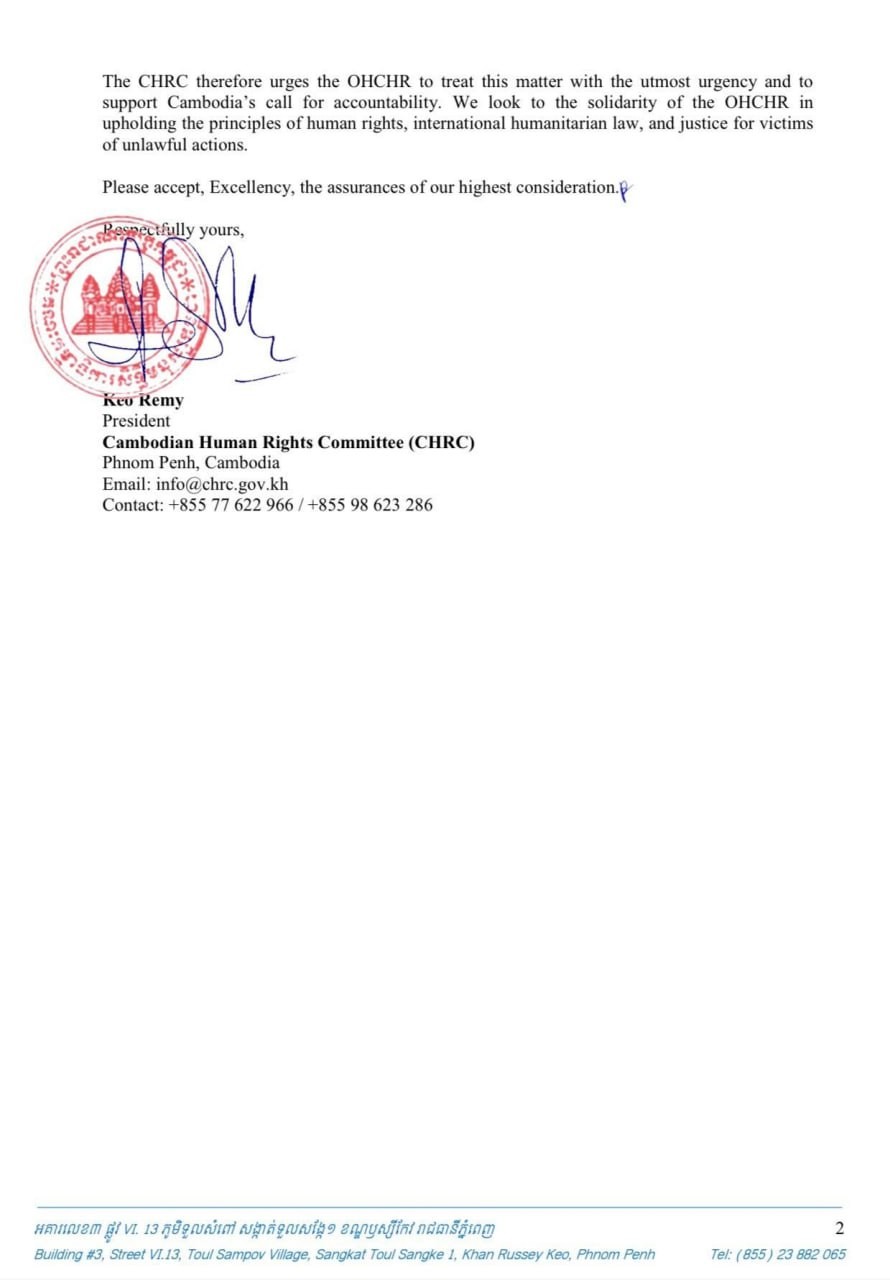 ក្នុងលិខិតរបស់ គណៈកម្មាធិការសិទ្ធិមនុស្សកម្ពុជា នៅថ្ងៃទី២ ខែតុលា ឆ្នាំ២០២៥ ជូនចំពោះ លោក Volker Türk ឧត្តមស្នងការអង្គការសហប្រជាជាតិទទួលបន្ទុកសិទ្ធិមនុស្ស, ការិយាល័យឧត្តមស្នងការអង្គការសហប្រជាជាតិទទួលបន្ទុកសិទ្ធិមនុស្ស (OHCHR), វិមានប្រជាជាតិ (Palais des Nations), CH-1211 ហ្សឺណែវ ១០ ប្រទេសស្វីស។
