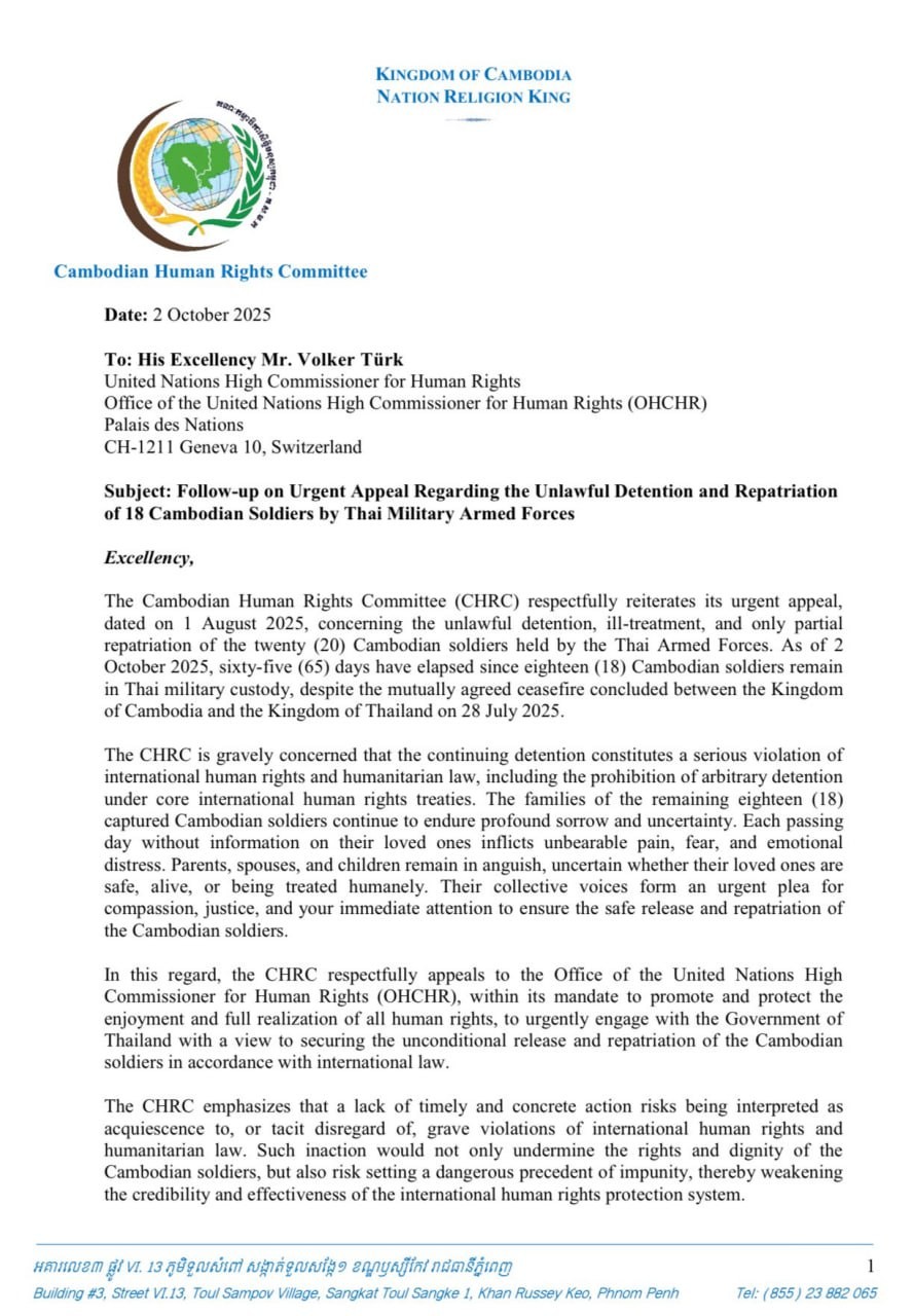 គណៈកម្មាធិការសិទ្ធិមនុស្សកម្ពុជា បានគូសបញ្ជាក់សាជាថ្មីចំពោះញត្តិបន្ទាន់របស់ គ.ស.ម.ក. ចុះថ្ងៃទី១ ខែសីហា ឆ្នាំ២០២៥ ពាក់ព័ន្ធនឹងការឃុំខ្លួនដោយខុសច្បាប់ ការប្រព្រឹត្តមិនគប្បី និងការធ្វើមាតុភូមិនិវត្តន៍កងទ័ពកម្ពុជាតែចំនួន ២នាក់ ត្រលប់មកវិញ ក្នុងចំណោម ២០នាក់ ដោយយោធាថៃ។ គិតត្រឹមថ្ងៃទី២ ខែតុលា ឆ្នាំ២០២៥ គឺមានរយៈ ៦៥ថ្ងៃហើយ ដែលកងទ័ពកម្ពុជាចំនួន ១៨នាក់ ត្រូវបានឃុំខ្លួនដោយយោធាថៃ ក្រោយពីកិច្ចព្រមព្រៀងស្តីពីបទឈប់បាញ់រវាងប្រទេសកម្ពុជា និងប្រទេសថៃចូលជាធរមាននៅពាក់កណ្តាលយប់ថ្ងៃទី២៨ ខែកក្កដា ឆ្នាំ២០២៥។