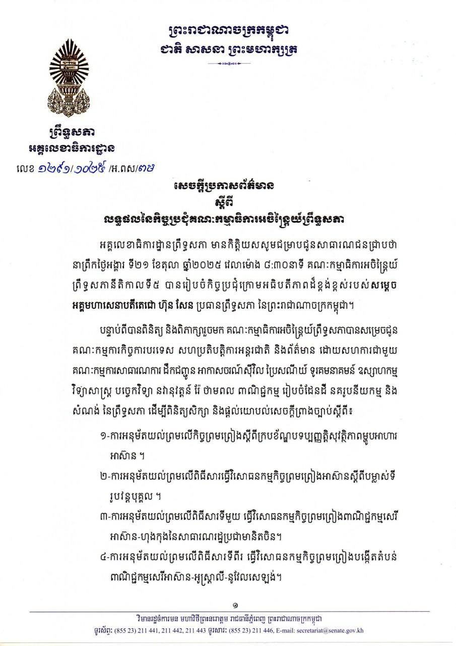 យោងតាមសេចក្ដីប្រកាសរបស់អគ្គលេខាធិការដ្ឋានព្រឹទ្ធសភាស្ដីពីលទ្ធផលនៃកិច្ចប្រជុំគណៈកម្មាធិការអចិន្ដ្រៃយ៍ព្រឹទ្ធសភាបានឲ្យដឹងថា បន្ទាប់ពីបានពិនិត្យ និងពិភាក្សារួចមក គណៈកម្មាធិការអចិន្ត្រៃយ៍ព្រឹទ្ធសភាបានសម្រេចជូន គណៈកម្មការកិច្ចការបរទេស សហប្រតិបត្តិការអន្តរជាតិ និងព័ត៌មាន និងគណៈកម្មការសាធារណការ ដឹកជញ្ជូន អាកាសចរណ៍ស៊ីវិល ប្រៃសណីយ៍ ទូរគមនាគមន៍ ឧស្សាហកម្ម វិទ្យាសាស្ត្រ បច្ចេកវិទ្យា នវានុវត្តន៍ រ៉ែ ថាមពល ពាណិជ្ជកម្ម រៀបចំដែនដី នគរូបនីយកម្ម និងសំណង់ នៃព្រឹទ្ធសភា ដើម្បី ពិនិត្យសិក្សា និងផ្តល់យោបល់សេចក្តីព្រាងច្បាប់ស្តីពី៖