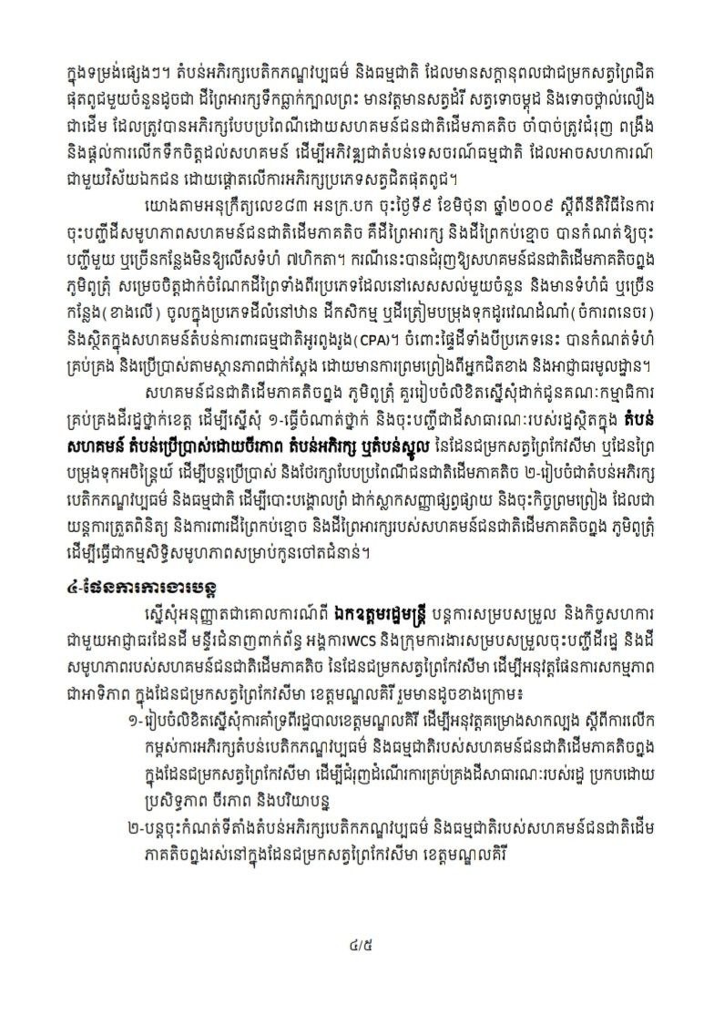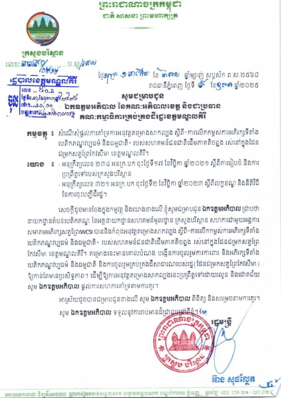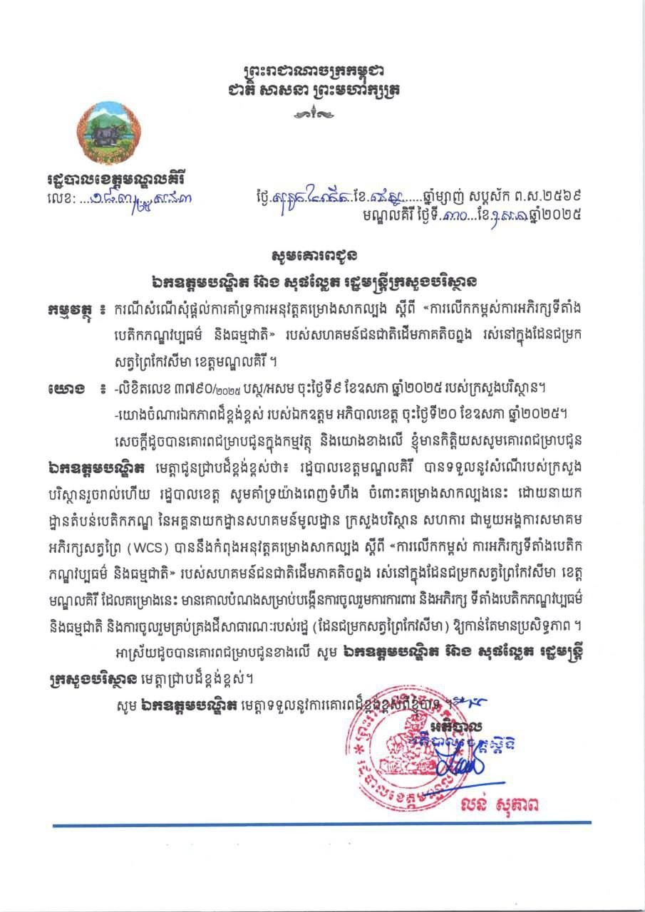 មណ្ឌលគិរី៖ បន្ទាប់ពីមានសំណើពីរដ្ឋមន្ត្រីក្រសួងបរិស្ថានសុំផ្តល់ការគាំទ្រការអនុវត្តគម្រោងសាកល្បងស្តីពី ការលើកកម្ពស់ការអភិរក្សទីតាំងបេតិកភណ្ឌវប្បធម៌ និងធម្មជាតិ របស់សហគមន៍ជនជាតិដើមភាគតិចព្នង(ពូនង) រស់នៅក្នុងដែនជម្រកសត្វព្រៃកែវសីមា ខេត្តមណ្ឌលគិរី រដ្ឋបាលខេត្តមណ្ឌលគិរី បានគាំទ្រយ៉ាងពេញទំហឹង ចំពោះគម្រោងសាកល្បងនេះ។