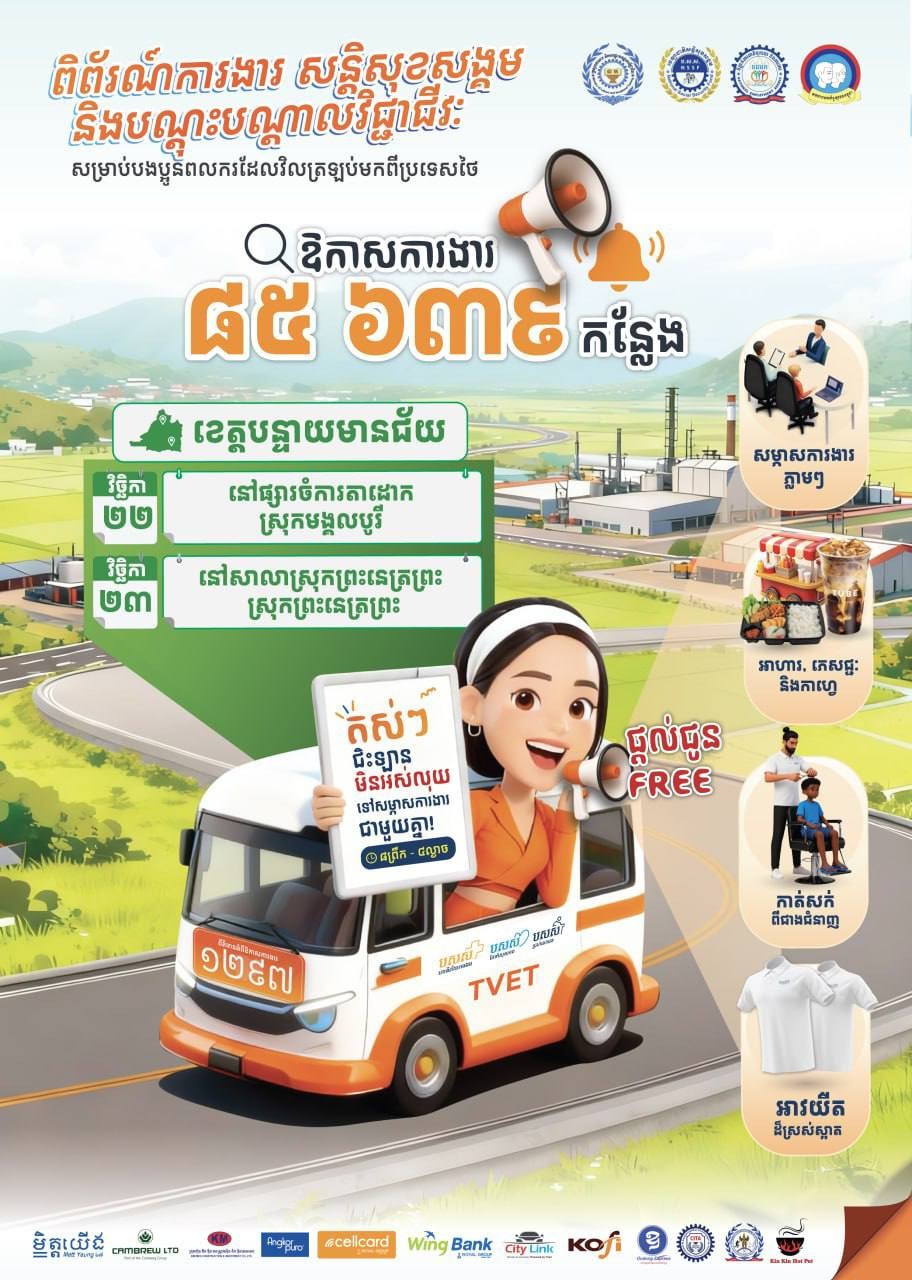 ក្រសួងការងារ នឹងបើកពិព័រណ៍ការងារ សន្តិសុខសង្គម និងបណ្តុះបណ្តាលវិជ្ជាជីវៈ ដោយនាំយកឱកាសការងាររាប់ម៉ឺនកន្លែងជូនអតីតពលករមកពីថៃនៅខេត្តបន្ទាយមានជ័យ