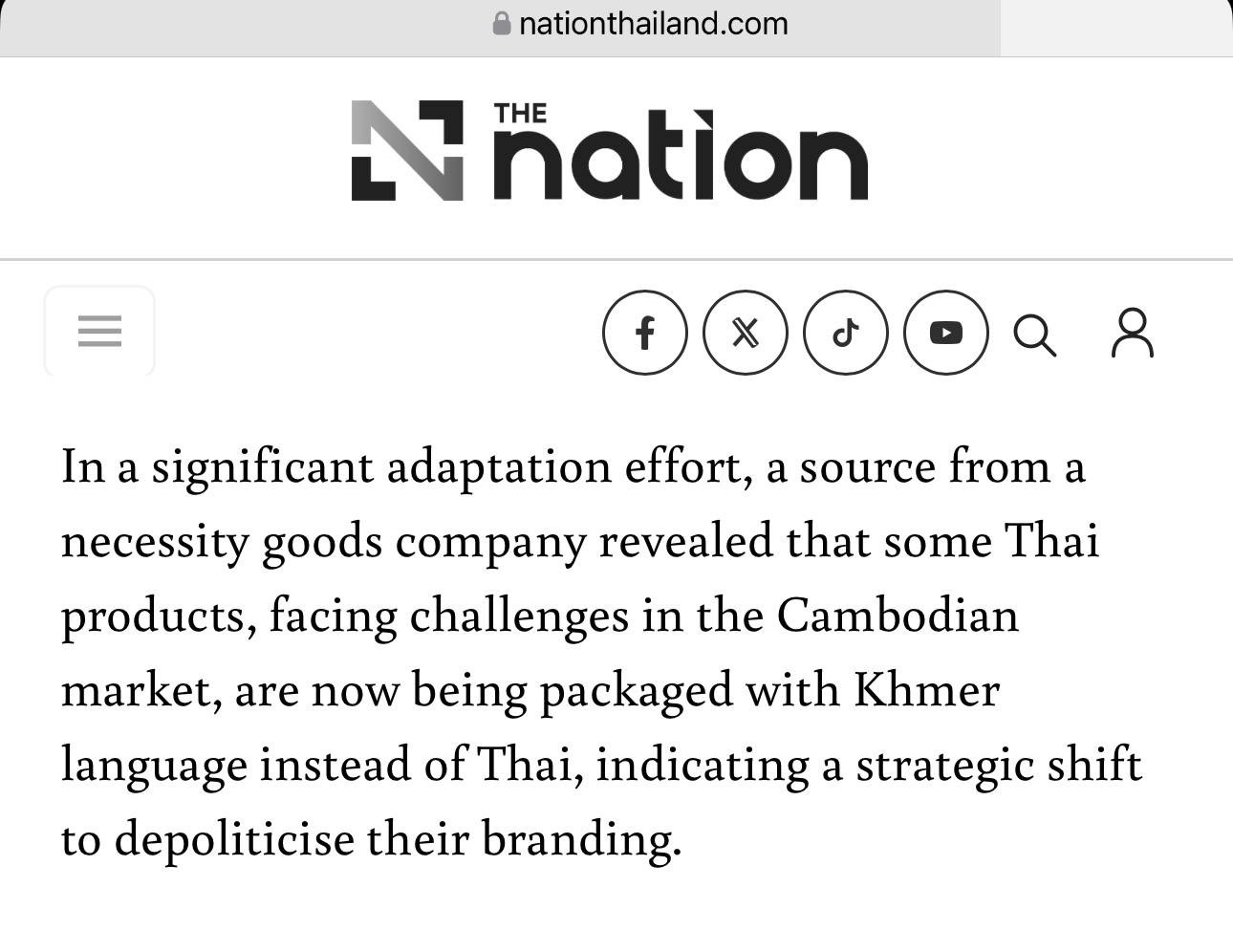 ថៃឡង់ដ៍៖ តាមរយៈអត្ថបទចុះផ្សាយដោយកាសែត The Nation Thailand កាលពីថ្ងៃទី២៥ ខែវិច្ឆិកា ឆ្នាំ ២០២៥ បានសរសេរថា ក្រុមហ៊ុនថៃមួយចំនួន បានចាប់ផ្តើមធ្វើការផ្លាស់ប្តូរការវេចខ្ចប់ថ្មី ដោយប្ដូរមកប្រើប្រាស់ភាសាខ្មែរនៅលើផលិតផលរបស់ខ្លួនជំនួសឱ្យអក្សរថៃ ដោយសង្ឃឹមថានឹងអាចគេចផុតពីបញ្ហានយោបាយ និងធ្វើឱ្យផលិតផលរបស់ពួកគេកាន់តែងាយស្រួលលក់នៅក្នុងប្រទេសកម្ពុជា ។