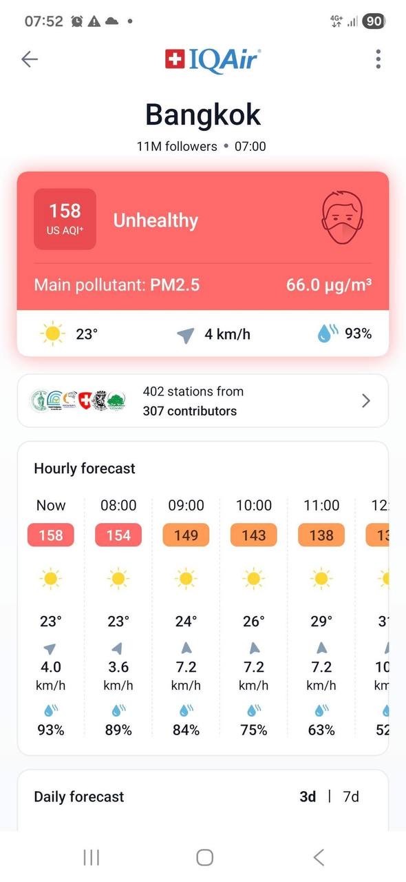 យោងតាមកម្មវិធីអាយឃ្យូអ៊ែរ (IQAir) នេះគឺជាថ្ងៃទី៣ ជាប់ៗគ្នាហើយសម្រាប់រាជធានីរបស់ប្រទេសថៃ ខណៈបច្ចុប្បន្ន ទីក្រុងបាងកកកំពុងឈរនៅលេខរៀងទី ១៨ ក្នុងចំណោមទីក្រុងធំៗដែលមានការបំពុលខ្យល់ខ្លាំងបំផុតនៅលើពិភពលោក ៕