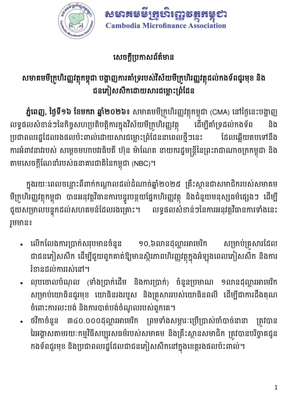 យោងតាមសេចក្តីប្រកាសព័ត៌មានសមាគមមីក្រូហិរញ្ញវត្ថុកម្ពុជា នៅថ្ងៃទី១៦ ខែមករា ឆ្នាំ២០២៦ បានបង្ហាញលទ្ធផលសំខាន់ៗ នៃកិច្ចសហប្រតិបត្តិការក្នុងវិស័យមីក្រូហិរញ្ញវត្ថុ ដើម្បីគាំទ្រដល់កងទ័ព និងប្រជាពលរដ្ឋដែលរងផលប៉ះពាល់ដោយសារជម្លោះព្រំដែននាពេលថ្មីៗនេះ ឆ្លើយតបទៅនឹងការអំពាវនាវរបស់សម្តេចមហាបវរធិបតី ហ៊ុន ម៉ាណែត នាយករដ្ឋមន្រ្តីនៃកម្ពុជា និងតាមសេចក្តីណែនាំរបស់ធនាគារជាតិនៃកម្ពុជា (NBC)។
