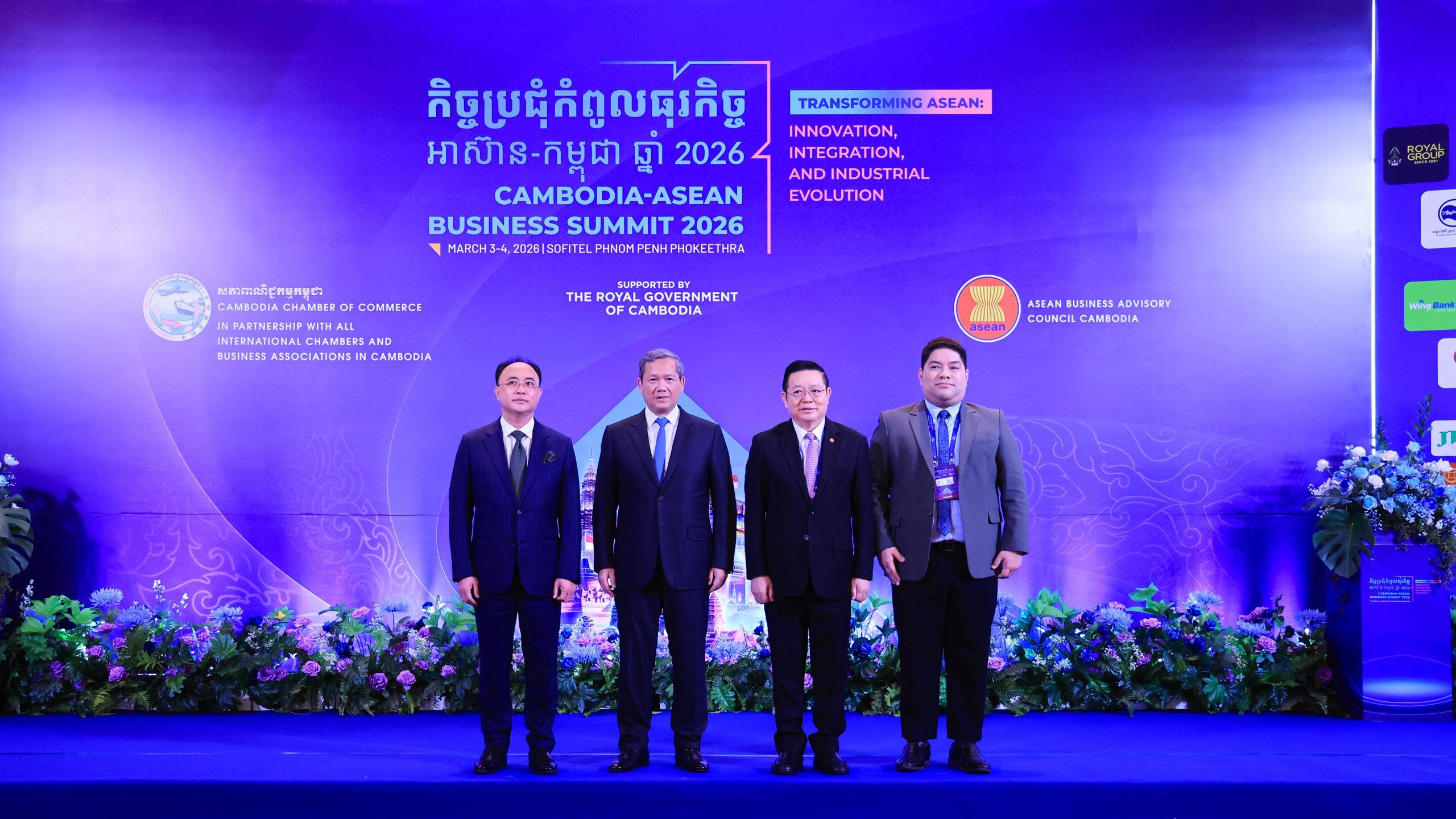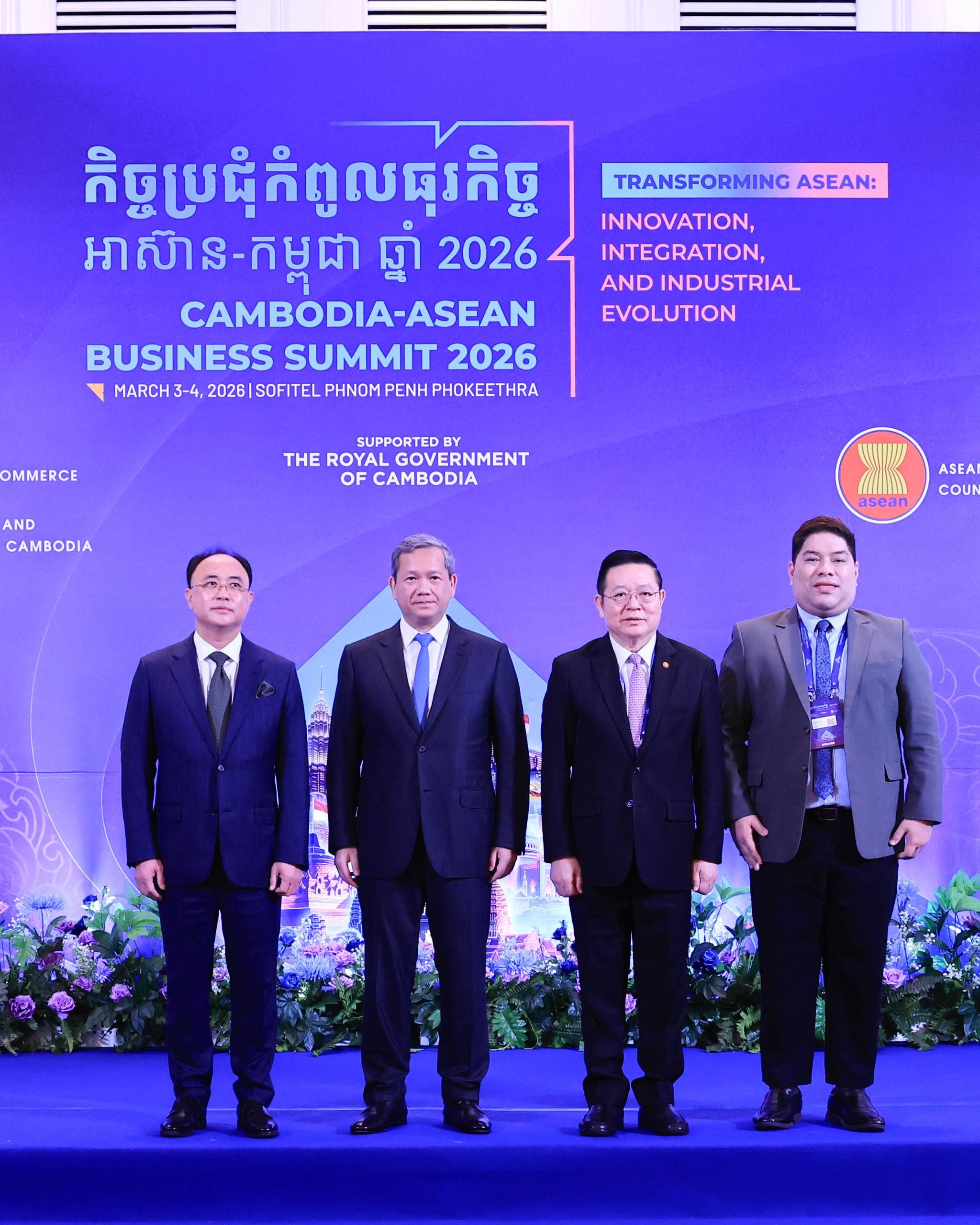 កម្មវិធីបើកកិច្ចប្រជ៉ំជាផ្លូវការនាព្រឹកថ្ងៃទី ៤ ខែមីនា ឆ្នាំ២០២៦ ក្រោមអធិបតីភាពដោយសម្តេចមហាបវរធិបតី ហ៊ុន ម៉ាណែត នាយករដ្ឋមន្ត្រី នៃកម្ពុជា ព្រមទាំងមានការចូលរួមដោយឯកឧត្តមបណ្ឌិត កៅ គឹមហួន អគ្គលេខាធិការ អាស៊ាន,លោក Anthony Patrick Chua, តំណាងប្រធានក្រុមប្រឹក្សាពិគ្រោះយោបល់ធុរកិច្ចអាស៊ាន ឆ្នាំ២០២៦ ប្រទេសហ្វីលីពីន,ឯកឧត្តម លោកជំទាវ ឯកអគ្គរាជទូតអាស៊ាន ឯកអគ្គរាជទូត និងអង្គទូត ,ឯកឧត្តម លោកជំទាវ សមាជិក-សមាជិកា នៃរាជរដ្ឋាភិបាលកម្ពុជា,អ្នកឧកញ៉ា ឧកញ៉ា និងបណ្តាធុរជន។