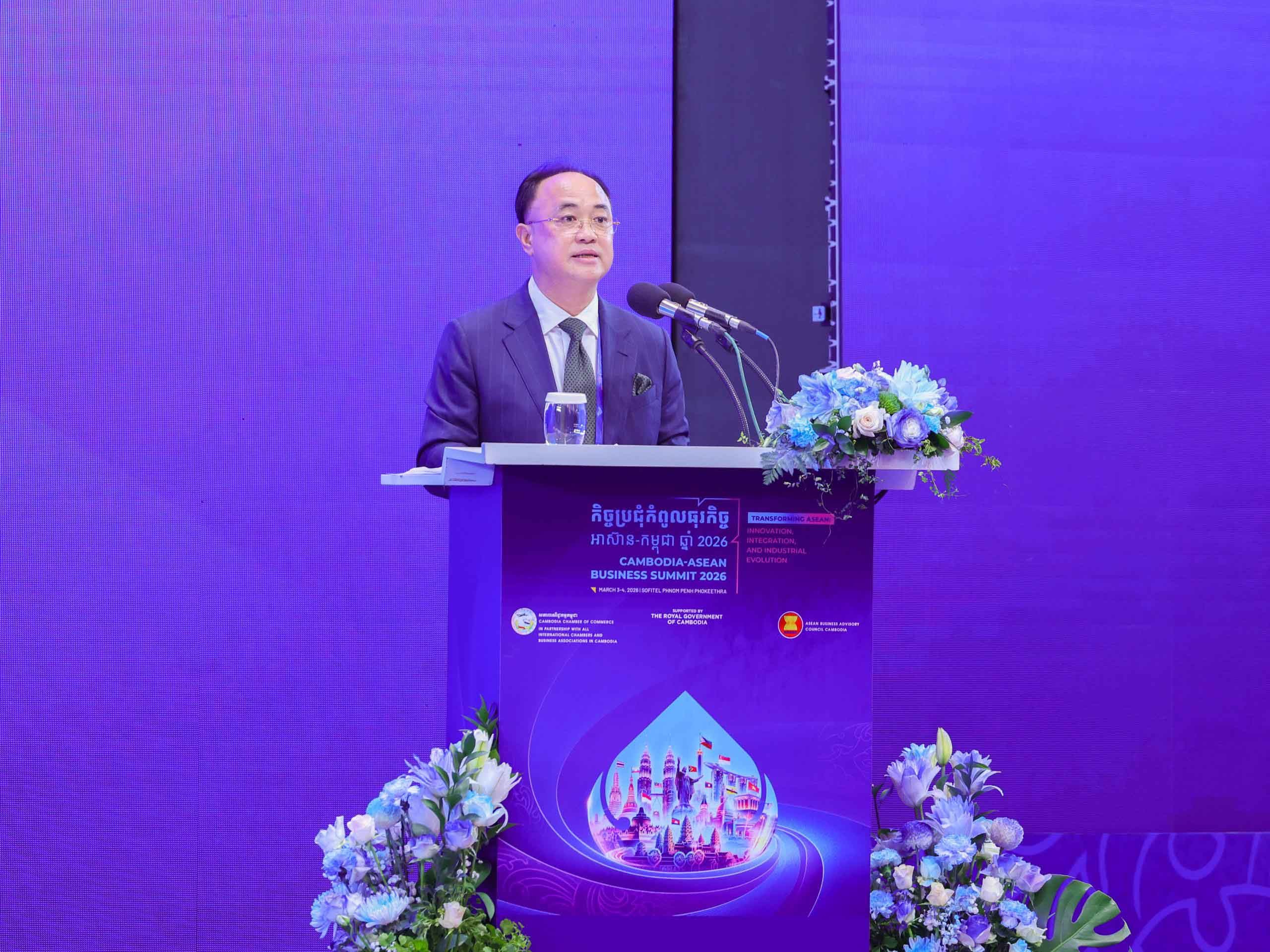 ការថ្លែងបែបនេះរបស់អ្នកឧកញ៉ា គិត ម៉េង ប្រធានសភាពាណិជ្ជកម្មកម្ពុជា និងជាប្រធានក្រុមប្រឹក្សាពិគ្រោះយោបល់ធុរកិច្ចអាស៊ាន-កម្ពុជា ក្នុងពិធីបើកកិច្ចប្រជុំកំពូលធុរកិច្ចអាស៊ាន-កម្ពុជា ឆ្នាំ២០២៦ ក្រោមអធិបតីភាពរបស់សម្តេចធិបតី ហ៊ុន ម៉ាណែត នាយករដ្ឋមន្ត្រីកម្ពុជា, ព្រមទាំងតំណាងក្រសួង-ស្ថាប័នរដ្ឋ និងអ្នកធុរកិច្ចជាតិ និងអន្តរជាតិជាច្រើនរូបផងដែរ នៅព្រឹកថ្ងៃទី៤ ខែមីនា ឆ្នាំ២០២៦ នាសណ្ឋាគារសូហ្វីតែល ភ្នំពេញ ភូគីត្រា។
