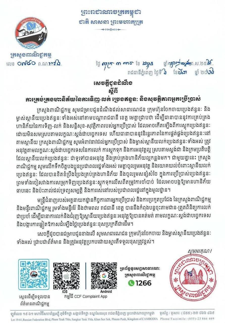 ភ្នំពេញ៖ ក្រសួងពាណិជ្ជកម្ម បានចេញសេចក្តីជូនដំណឹង អំពាវនាវដល់សាធារណជន ក្រុមហ៊ុនចែកចាយ និងម្ចាស់ស្ថានីយលក់ប្រេងឥន្ធនៈទាំងអស់ ឱ្យអនុវត្តតាមលក្ខណៈស្តង់ដាបច្ចេកទេសក្នុងការលក់ និងស្តុកទុកប្រេងឥន្ធនៈ ដើម្បីគ្រប់គ្រងហានិភ័យ និងធានាសុវត្ថិភាពរបស់អ្នកប្រើប្រាស់ ព្រមទាំងរក្សានិរន្តរភាពនៃការផ្គត់ផ្គង់ប្រេងឥន្ធនៈនៅតាមស្ថានីយ។