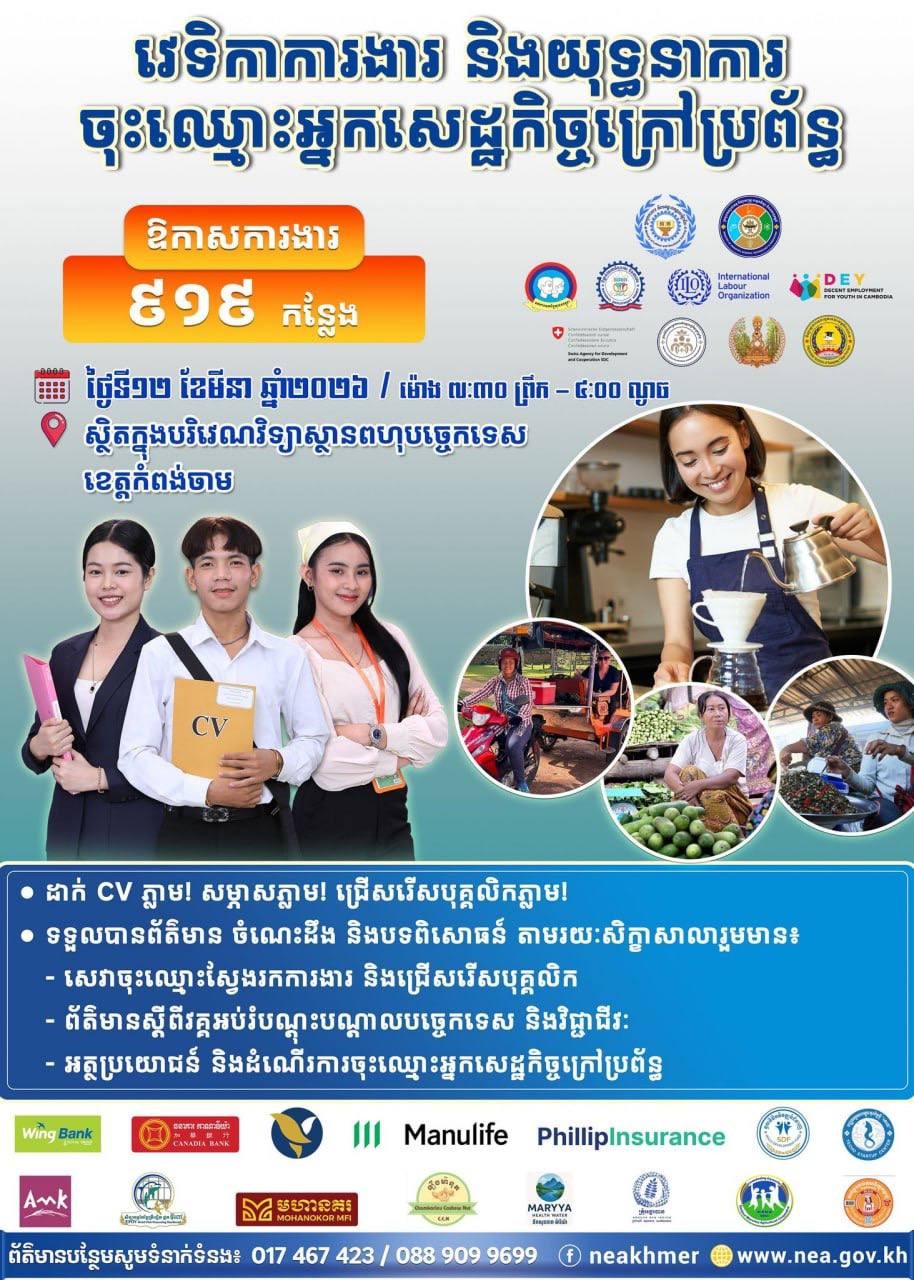 កំពង់ចាម៖ ក្រសួងការងារ និងបណ្តុះបណ្តាលវិជ្ជាជីវៈ គ្រោងនាំយកឱកាសការងារសរុបចំនួន ៩១៩ កន្លែងតាមរយៈ«វេទិកាការងារ និងយុទ្ធនាការចុះឈ្មោះអ្នកសេដ្ឋកិច្ចក្រៅប្រព័ន្ធ» ទៅកាន់ខេត្ដកំពង់ចាមសម្រាប់អតីតពលករខ្មែរ និងអ្នកកំពុងស្វែងរកការងារ ដែលរៀបចំនៅថ្ងៃទី ១២ ខែមីនា ឆ្នាំ២០២៦ នៅវិទ្យាស្ថានពហុបច្ចេកទេសខេត្តកំពង់ចាម។