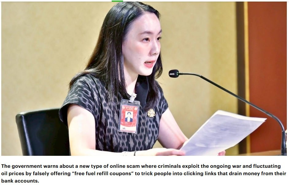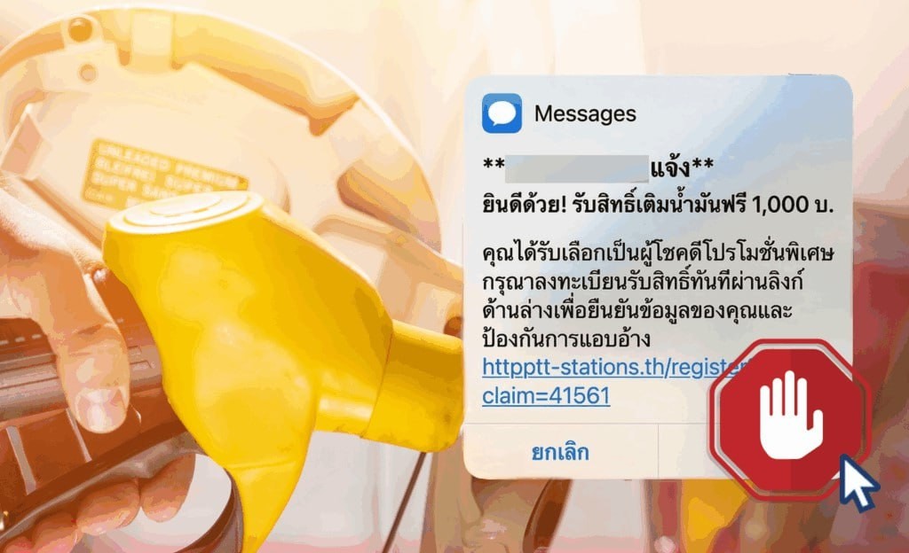 ថៃឡង់ដ៍៖ មជ្ឈមណ្ឌលប្រឆាំងបទល្មើសតាមប្រព័ន្ធអនឡាញរបស់ប្រទេសថៃ (AOC) បានចេញការព្រមានអំពីក្រុមឆបោក ដែលកំពុងឆ្លៀតឱកាសពេលតម្លៃប្រេងឡើងថ្លៃ តាមរយៈការផ្ញើសារមកកាន់ពលរដ្ឋ ក្រោមរូបភាពផ្ដល់ «បណ្ណចាក់សាំងឥតគិតថ្លៃ ឬការបញ្ចុះតម្លៃពិសេស» ដើម្បីល្បួងឱ្យជនរងគ្រោះចុចលើតំណភ្ជាប់ (Link) ក្លែងក្លាយ ។