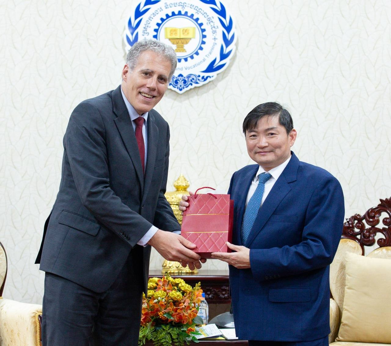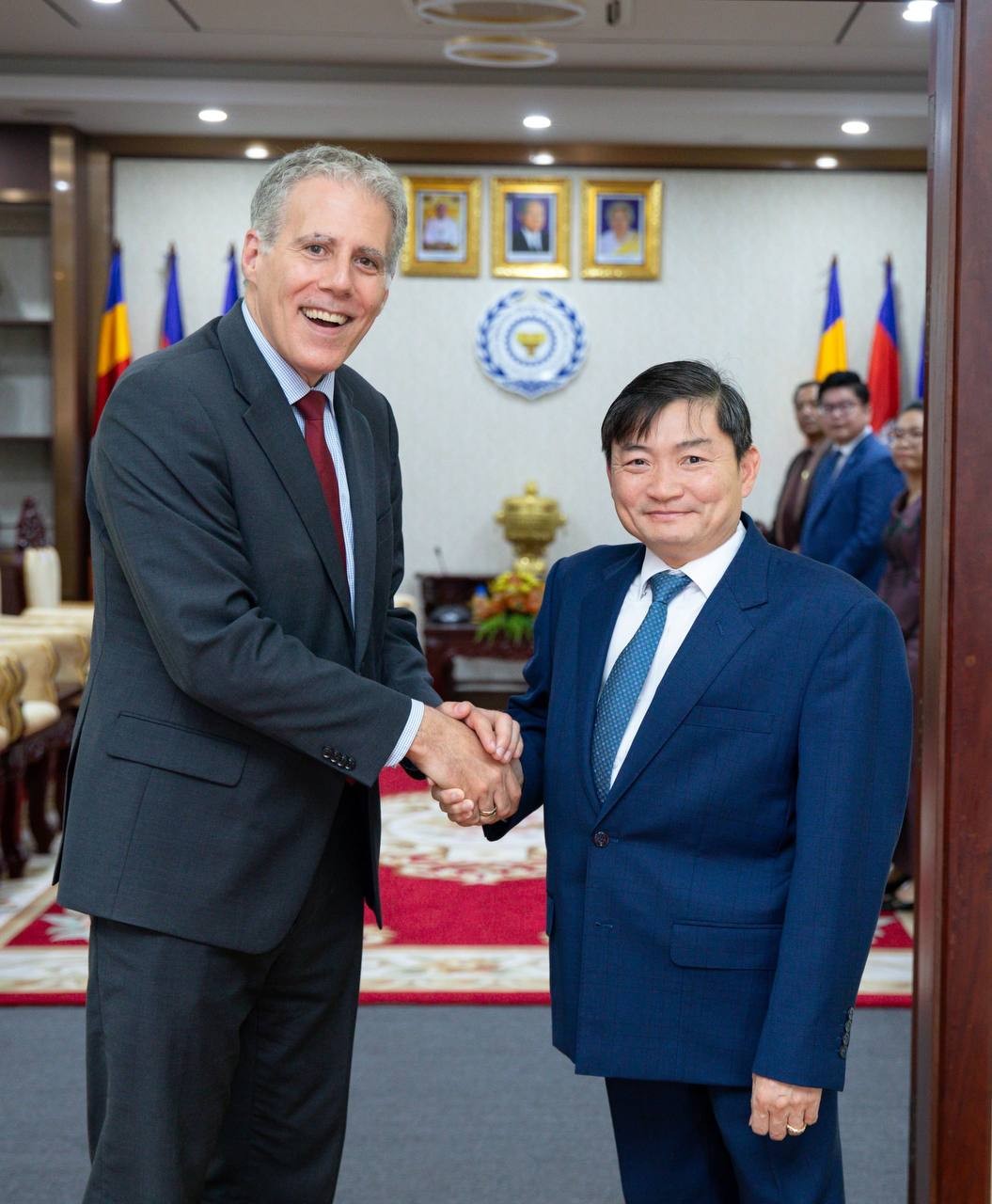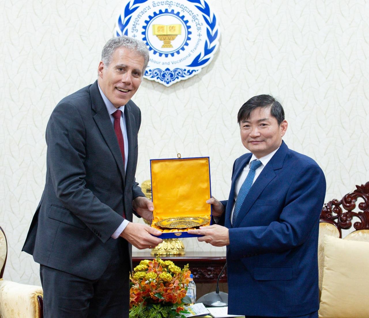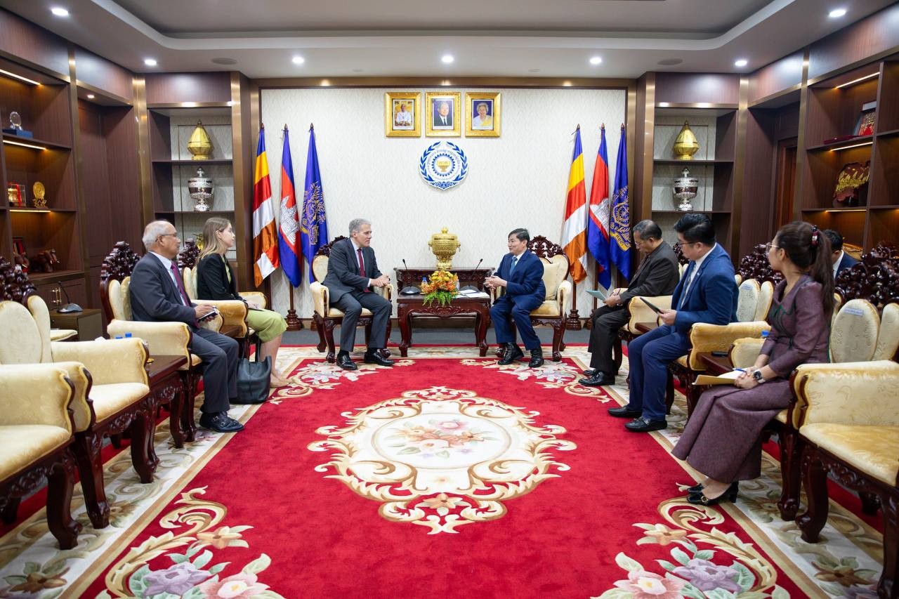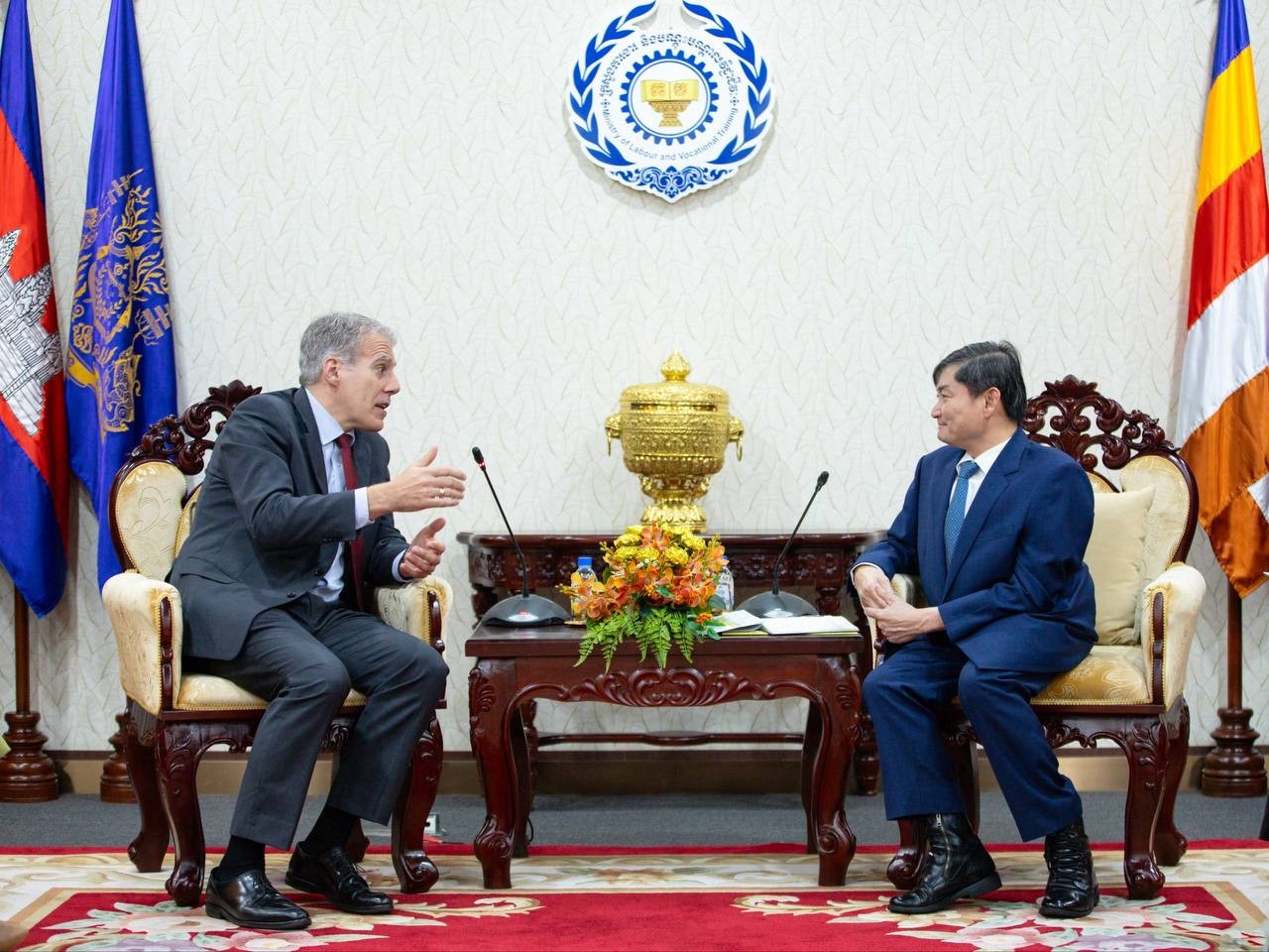 ភ្នំពេញ៖ លោក ហេង សួរ រដ្ឋមន្ត្រីក្រសួងការងារ និងបណ្តុះបណ្តាលវិជ្ជាជីវៈ បានអនុញ្ញាតឱ្យលោក គ្រីស្ទៀន ដេរ៉ូហ្ស (Christian DesRoches) ឯកអគ្គរដ្ឋទូតវិសាមញ្ញ និងពេញសមត្ថភាពនៃប្រទេសកាណាដាប្រចាំកម្ពុជា ចូលជួបសម្ដែងការគួរសម និងពិភាក្សាការងារ នៅទីស្តីការក្រសួង ដើម្បីពង្រឹងកិច្ចសហប្រតិបត្តិការទ្វេភាគីលើវិស័យការងារ សន្តិសុខសង្គម និងការបណ្តុះបណ្តាលវិជ្ជាជីវៈ។