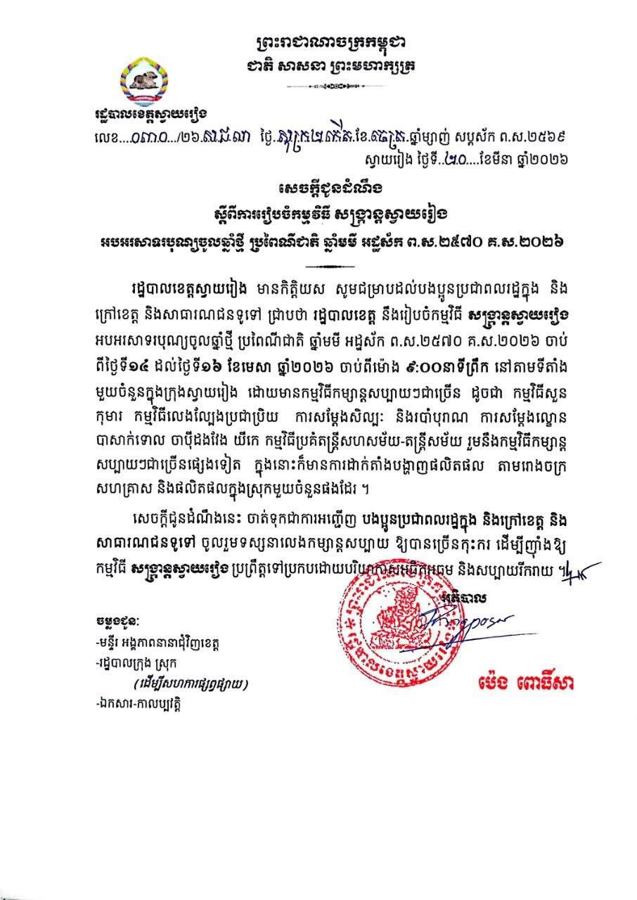 ស្វាយរៀង៖ រដ្ឋបាលខេត្តស្វាយរៀង នឹងរៀបចំកម្មវិធី សង្ក្រាន្តស្វាយរៀង ដើម្បីអបអរសាទរបុណ្យចូលឆ្នាំថ្មី ប្រពៃណីជាតិ ឆ្នាំមមី អដ្ឋស័ក ព.ស.២៥៧០ គ.ស.២០២៦ ចាប់ ពីថ្ងៃទី១៤ ដល់ថ្ងៃទី១៦ ខែមេសា ឆ្នាំ២០២៦ នៅតាមទីតាំង មួយចំនួនក្នុងក្រុងស្វាយរៀង។
