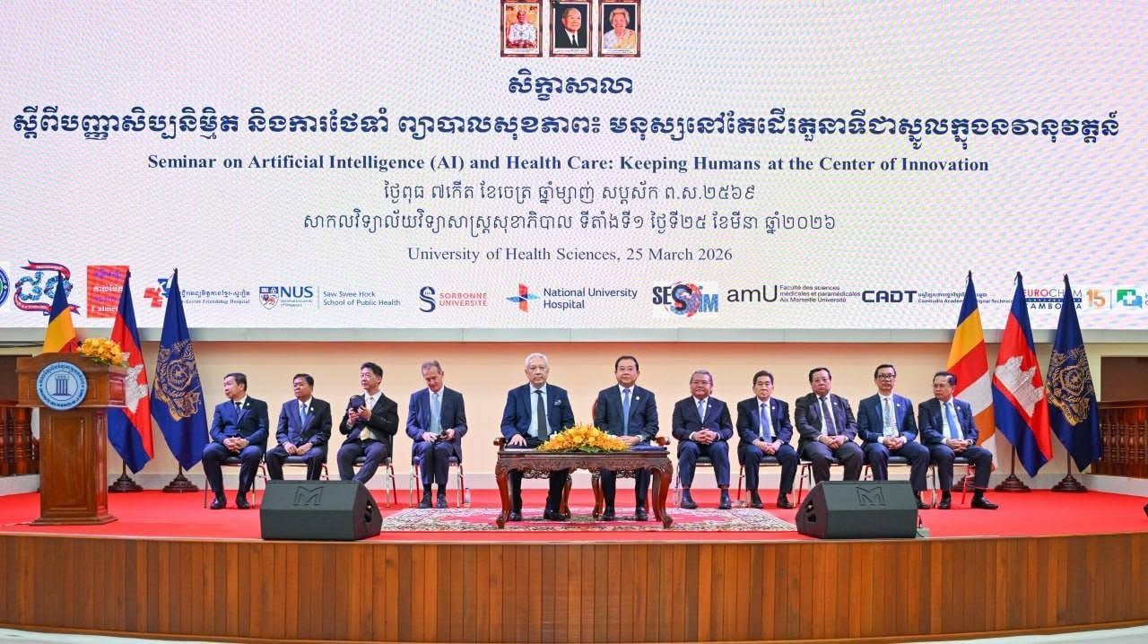 ភ្នំពេញ៖ លោកសាស្រ្តាចារ្យ ឈាង រ៉ា រដ្ឋមន្ត្រីក្រសួងសុខាភិបាល នៅថ្ងៃទី២៥ ខែមីនា ឆ្នាំ២០២៦ បានអញ្ជើញក្នុងឱកាសសិក្ខាសាលា «បញ្ញាសិប្បនិម្មិត និងសុខាភិបាល៖ ការរក្សាមនុស្សជាគន្លងស្នូលនៃនវានុវត្តន៍» ដែលរៀបចំឡើង នៅសាកលវិទ្យាល័យវិទ្យាសាស្ត្រសុខាភិបាល។