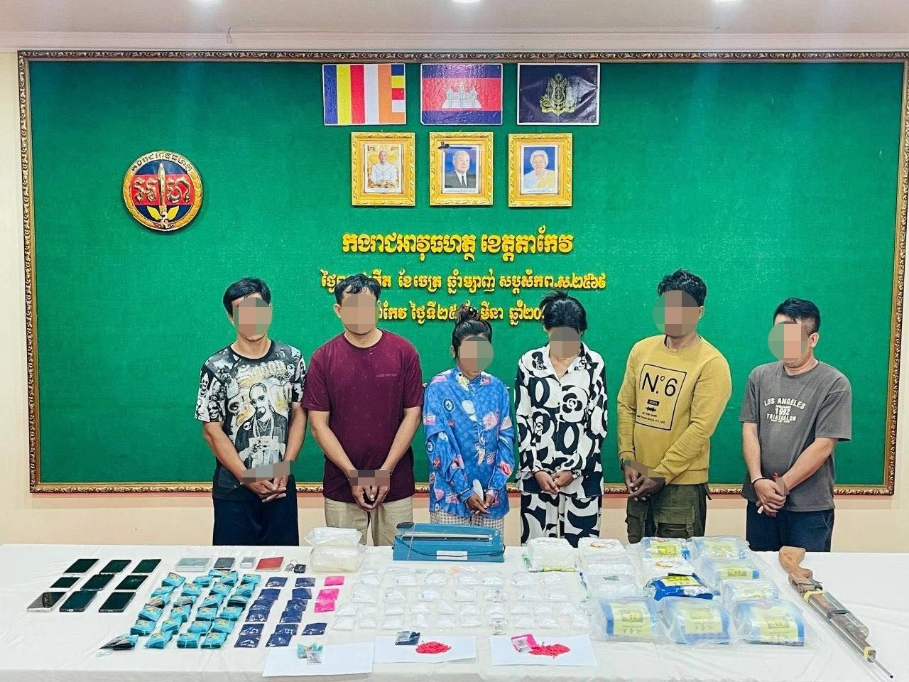 កងរាជអាវុធហត្ថខេត្តតាកែវ បើកប្រតិបត្តិការបង្ក្រាបគ្រឿងញៀនទ្រង់ទ្រាយធំ ឃាត់ខ្លួនជនសង្ស័យ ៦នាក់ និងដកហូតថ្នាំញៀនជាង ១៥គីឡូក្រាម