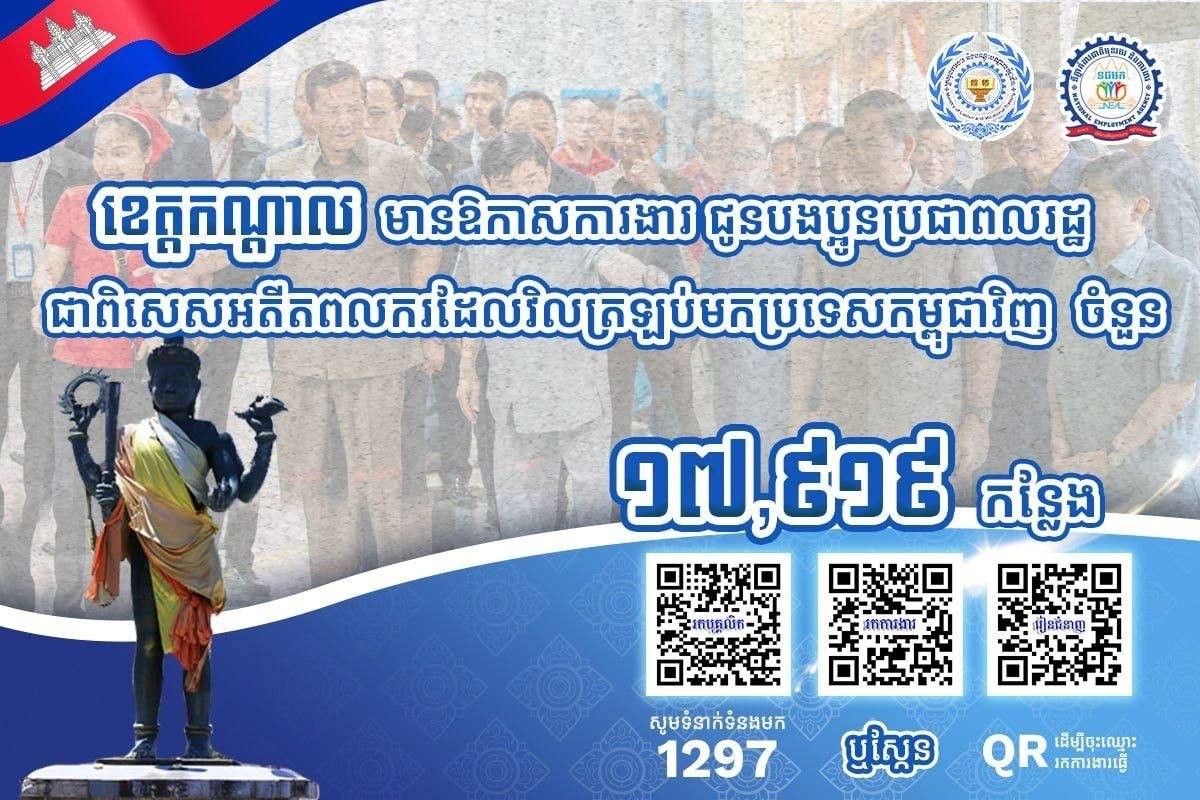 តាមរយៈការផ្សព្វផ្សាយ ក្រសួងការងារ បានឱ្យដឹងថា គិតត្រឹមថ្ងៃទី២៨ ខែមីនា ឆ្នាំ២០២៦នេះ ខេត្តតាកែវ កំពង់ស្ពឺ និងខេត្តកណ្ដាលមានឱកាសការងារសរុបចំនួន ៤៤,៦០០កន្លែង កំពុងរង់ចាំបងប្អូនអតីតពលករត្រឡប់មកពីប្រទេសថៃ និងអ្នកកំពុងស្វែងរកការងារធ្វើនៅក្នុងវិស័យឧស្សាហកម្ម និងវិស័យសេវាកម្ម។
