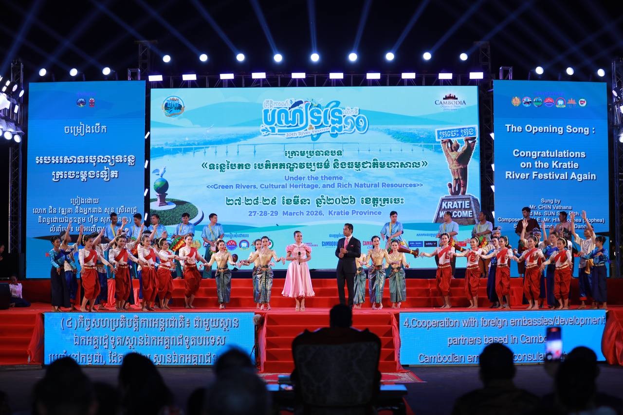ជាមួយគ្នានេះដែរ ក៏មានពិធីប្រកាសបើកព្រឹត្តិការណ៍បុណ្យទន្លេលើកទី១០ ក៏មានការអុជកាំជ្រួចដើម្បីអបអរសាទរព្រឹត្តិការណ៍បុណ្យទន្លេលើកទី១០ ឆ្នាំ២០២៦, ការសម្តែងទស្សនីយភាពសិល្បៈ, ចម្រៀងបើកអបអរសាទរបុណ្យទន្លេក្រចេះ ច្រៀងដោយ អ្នកនាង សុន ស្រីពេជ្រ និងលោក ជិន វឌ្ឍនា ដោយមានចម្រៀង៖ ព្រះរាជនិពន្ធព្រះករុណាព្រះបាទសម្តេចព្រះ នរោត្តម សីហនុ ព្រះមហាវីរក្សត្រ ព្រះវររាជបិតា ឯករាជ្យ បូរណភាពទឹកដី និងឯកភាពជាតិខ្មែរ ព្រះបរមរតនកោដ្ឋ មានចំណងជើងថា “ស្នេហា” ច្រៀងដោយ អ្នកនាង ទៀងមុំ សុធាវី។