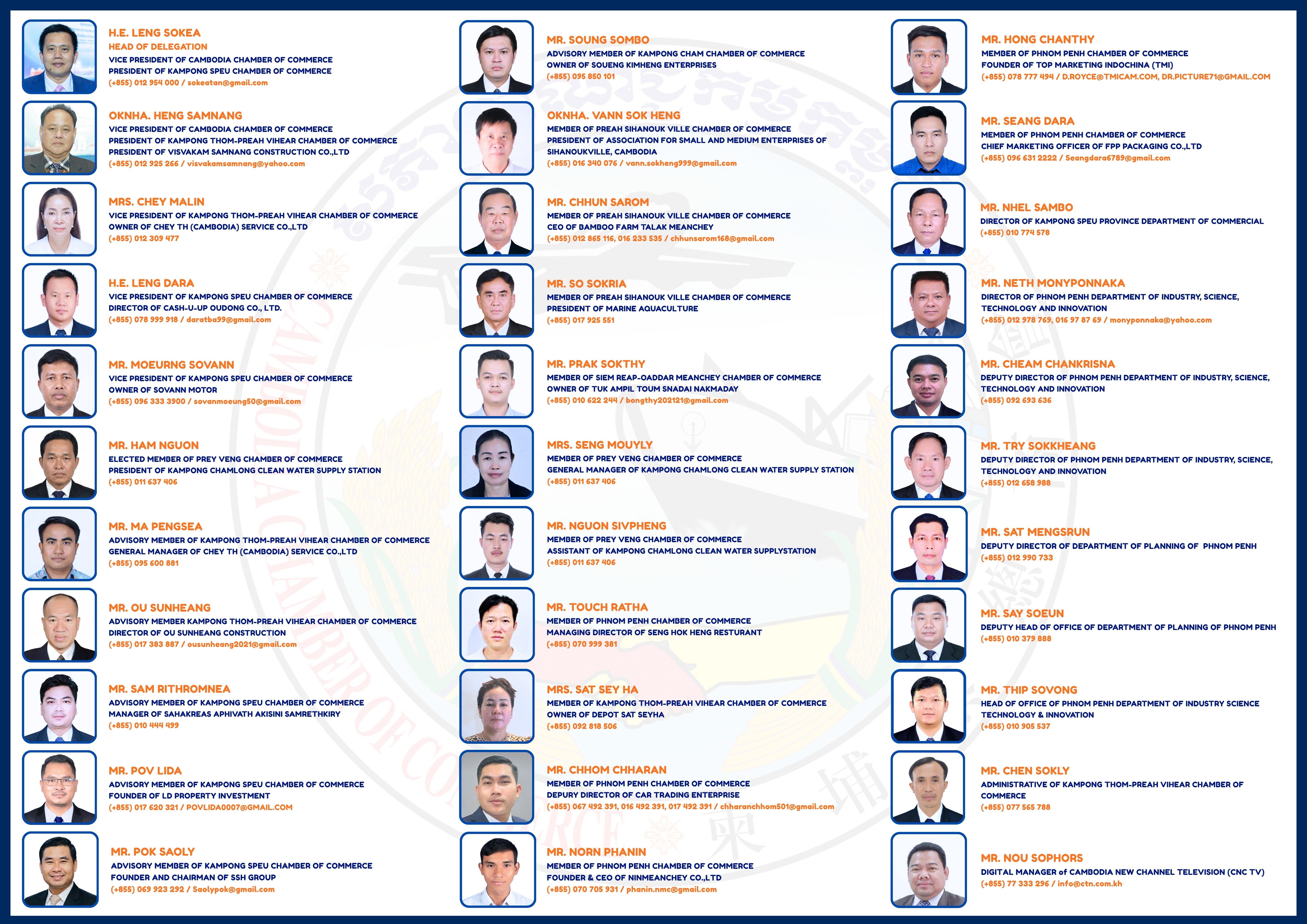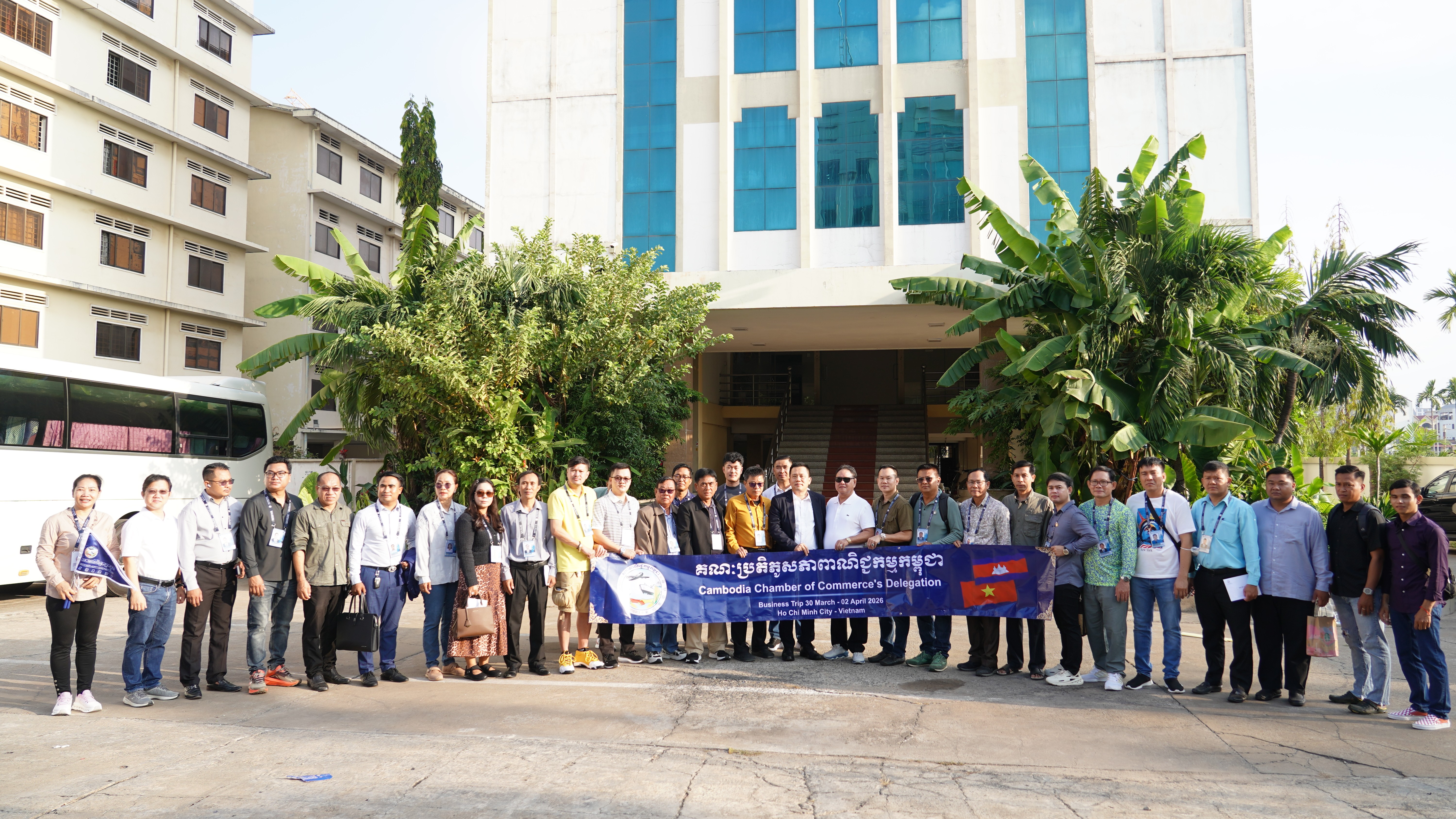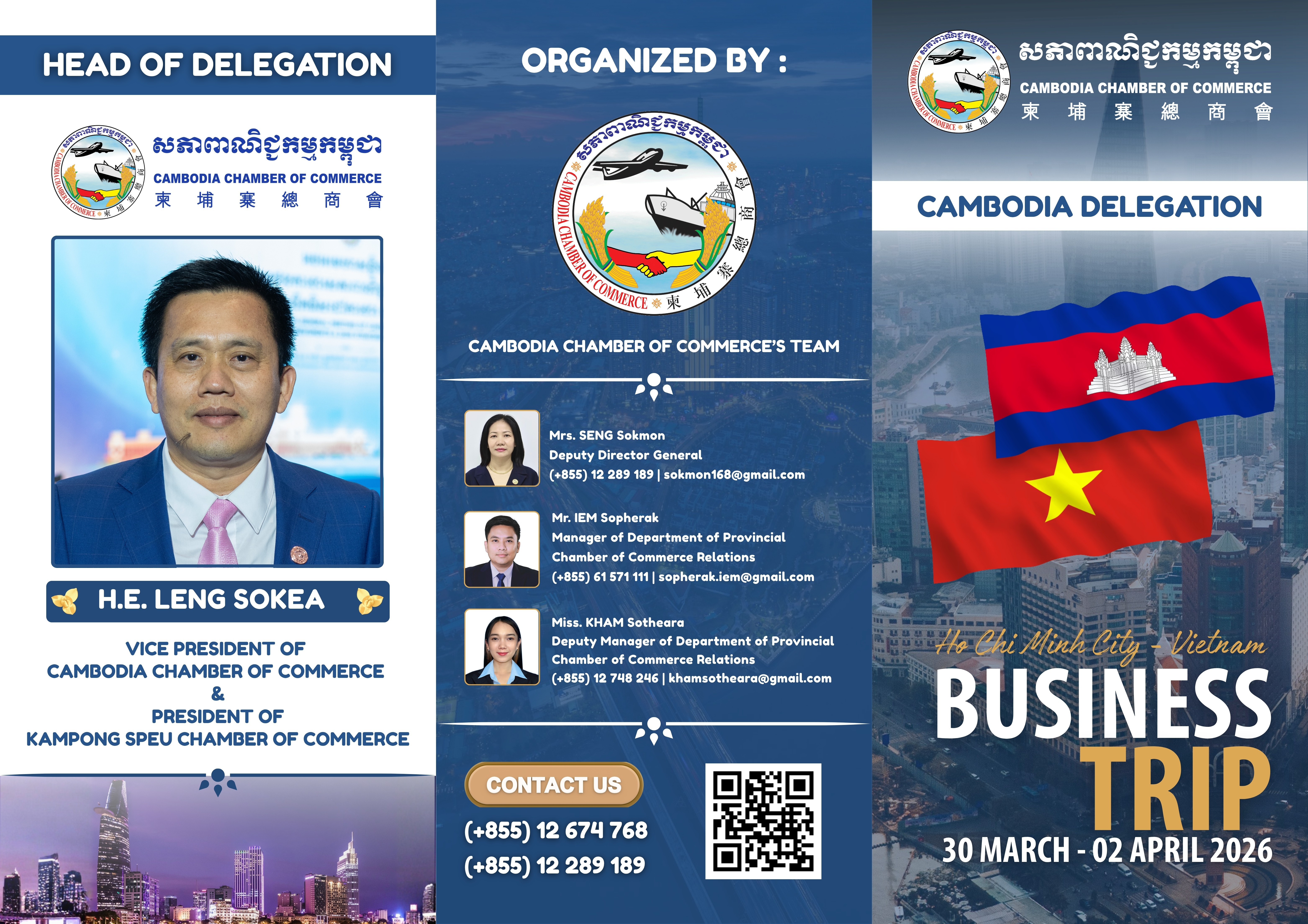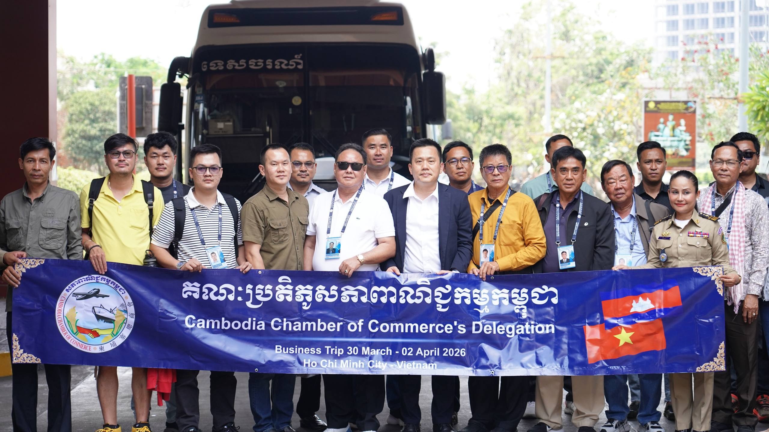 ភ្នំពេញ៖ ដោយទទួលបានការអនុញ្ញាតពី អ្នកឧកញ៉ា គិត ម៉េង ប្រធានសភាពាណិជ្ជកម្មកម្ពុជា និងជាប្រធានក្រុមប្រឹក្សាពិគ្រោះយោបល់ធុរកិច្ចអាស៊ានសម្រាប់កម្ពុជា នាព្រឹកថ្ងៃទី៣០ ខែមីនា ឆ្នាំ២០២៦ លោក ឡេង សុខគា អនុប្រធានសភាពាណិជ្ជកម្មកម្ពុជា និងជាប្រធានសភាពាណិជ្ជកម្មខេត្តកំពង់ស្ពឺ នឹងដឹកនាំគណៈប្រតិភូសភាពាណិជ្ជកម្មកម្ពុជា ចំនួន ៣៦រូប បំពេញទស្សនកិច្ចពាណិជ្ជកម្មទៅទីក្រុងហូជីមិញ នៃសាធារណៈរដ្ឋសង្គមនិយមវៀតណាម ចាប់ពីថ្ងៃទី៣០ ខែមីនា ដល់ថ្ងៃទី០២ ខែមេសា ឆ្នាំ២០២៦។