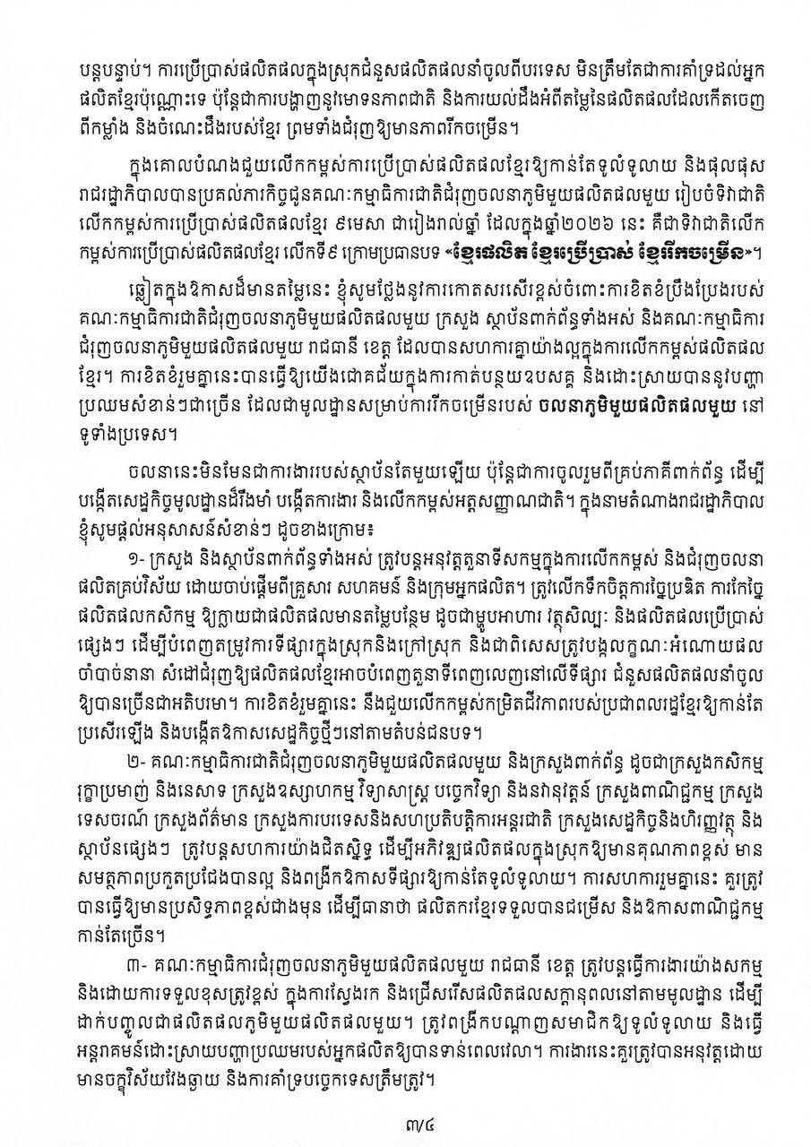 ក្នុងសារលិខិតអបអរសាទរ ក្នុងឱកាសទិវាជាតិលើកកម្ពស់ការប្រើប្រាស់ផលិតផលខ្មែរ ៩មេសា លើកទី៩ ឆ្នាំ២០២៦ ក្រោមប្រធានបទ «ខ្មែរផលិត ខ្មែរប្រើប្រាស់ ខ្មែររីកចម្រើន» សម្តេចបវរធិបតី ហ៊ុន ម៉ាណែត នាយករដ្ឋមន្ត្រីនៃកម្ពុជា បានសង្កត់ធ្ងន់ថា៖ «យើងខិតខំផលិត យើងជួយប្រើប្រាស់ ជាតិយើងនឹងរីកចម្រើន!»។