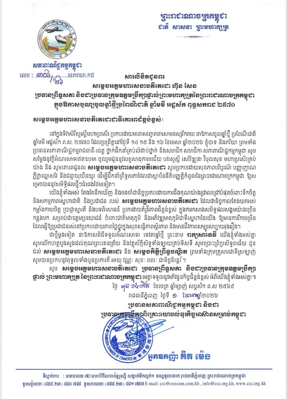 ក្នុងសារលិខិត អ្នកឧកញ៉ា គិត ម៉េង បានលើកឡើងថា “នៅក្នុងទិវាសិរីសួរស្តីមហាប្រសើរ ប្រកបដោយមនោសញ្ចេតនាសោមនស្សរីករាយ នាឱកាសចូលឆ្នាំថ្មី ប្រពៃណីជាតិ ឆ្នាំមមី អដ្ឋស័ក ព.ស. ២៥៧០ ដែលប្រព្រឹត្តនៅថ្ងៃទី១៤ ១៥ និង ១៦ ខែមេសា ឆ្នាំ២០២៦ ខ្ញុំបាទ និងភរិយា ព្រមទាំង ប្រធានសភាពាណិជ្ជកម្មរាជធានី-ខេត្ត ថ្នាក់ដឹកនាំគ្រប់លំដាប់ថ្នាក់ និងសមាជិក សមាជិកា សភាពាណិជ្ជកម្មកម្ពុជា សូមសម្តែងនូវក្តីអំណរសាទរឥតឧបមា ចូលរួមជូននូវសព្ទសាធុការពរជ័យ ចូលរួមជូននូវសព្ទសាធុការពរជ័យ បវរ បវរសួស្តី សេរីវឌ្ឍនា វិបុលសុខ មហាប្រសើរគ្រប់ យ៉ាង និងសូមគោរពជូនពរសម្តេចអគ្គមហាសេនាបតីតេជោ សូមប្រកបដោយសុខភាពបរិបូរណ៍ បញ្ញាញាណ ភ្លឺថ្លាឈ្លាសវៃ និងជន្មាយុយឺនយូរ ដើម្បីដឹកនាំព្រឹទ្ធសភាដែលជាស្ថាប័ននីតិបញ្ញត្តិកំពូលនៃព្រះរាជាណាចក្រកម្ពុជា ឱ្យស ម្រេចបាននូវសមិទ្ធិផលថ្មីៗធំធេងថែមទៀត។