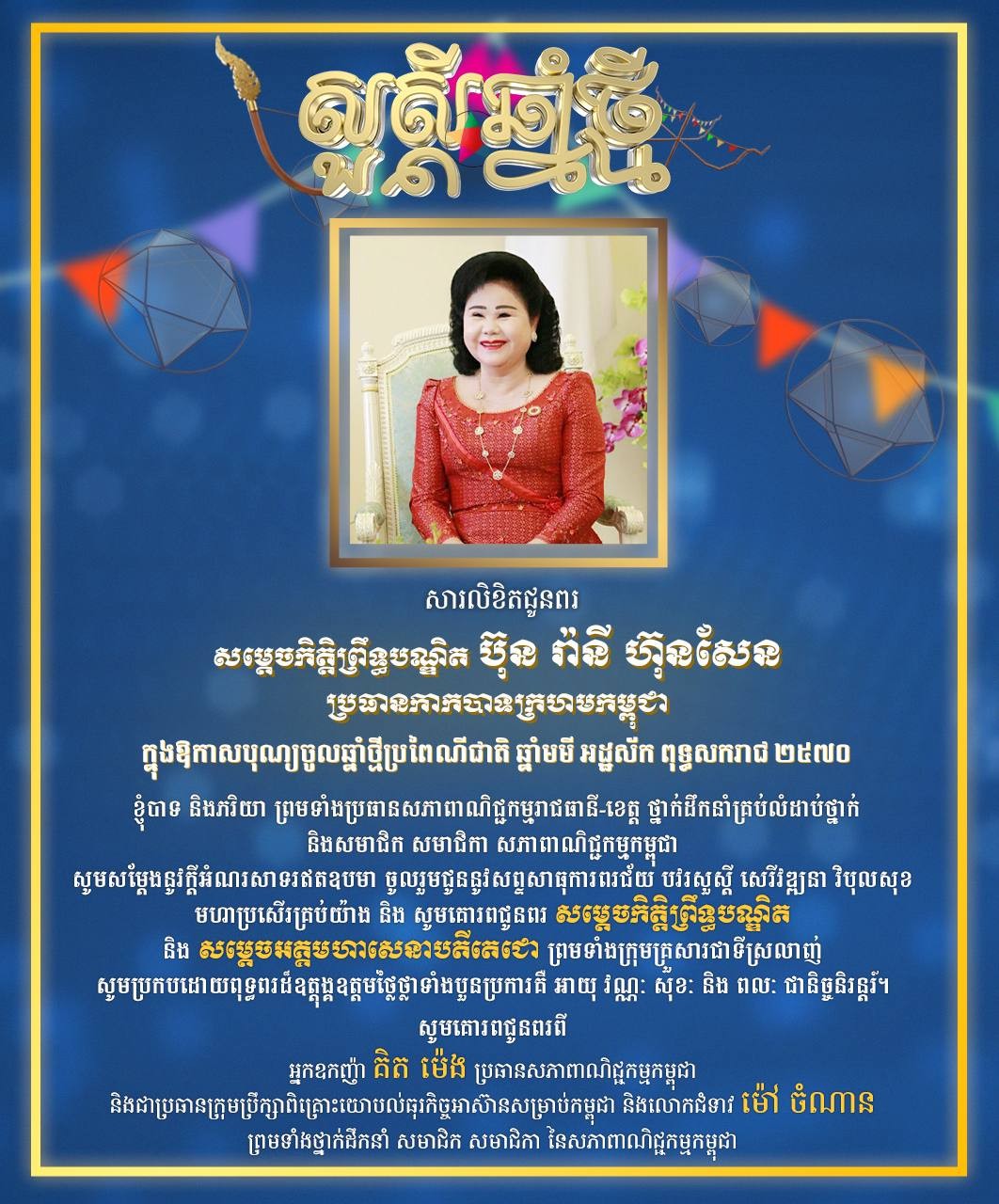 អ្នកឧកញ៉ា គិត ម៉េង និងលោកជំទាវ អ្នកឧកញ៉ា ម៉ៅ ចំណាន គិតម៉េង ផ្ញើសារលិខិតជូនពរជូនពរសម្តេចកិត្តិព្រឹទ្ធបណ្ឌិត ប៊ុន រ៉ានី ហ៊ុនសែន ប្រធានកាកបាទក្រហមកម្ពុជា ក្នុងឱកាសបុណ្យចូលឆ្នាំថ្មីប្រពៃណីជាតិ