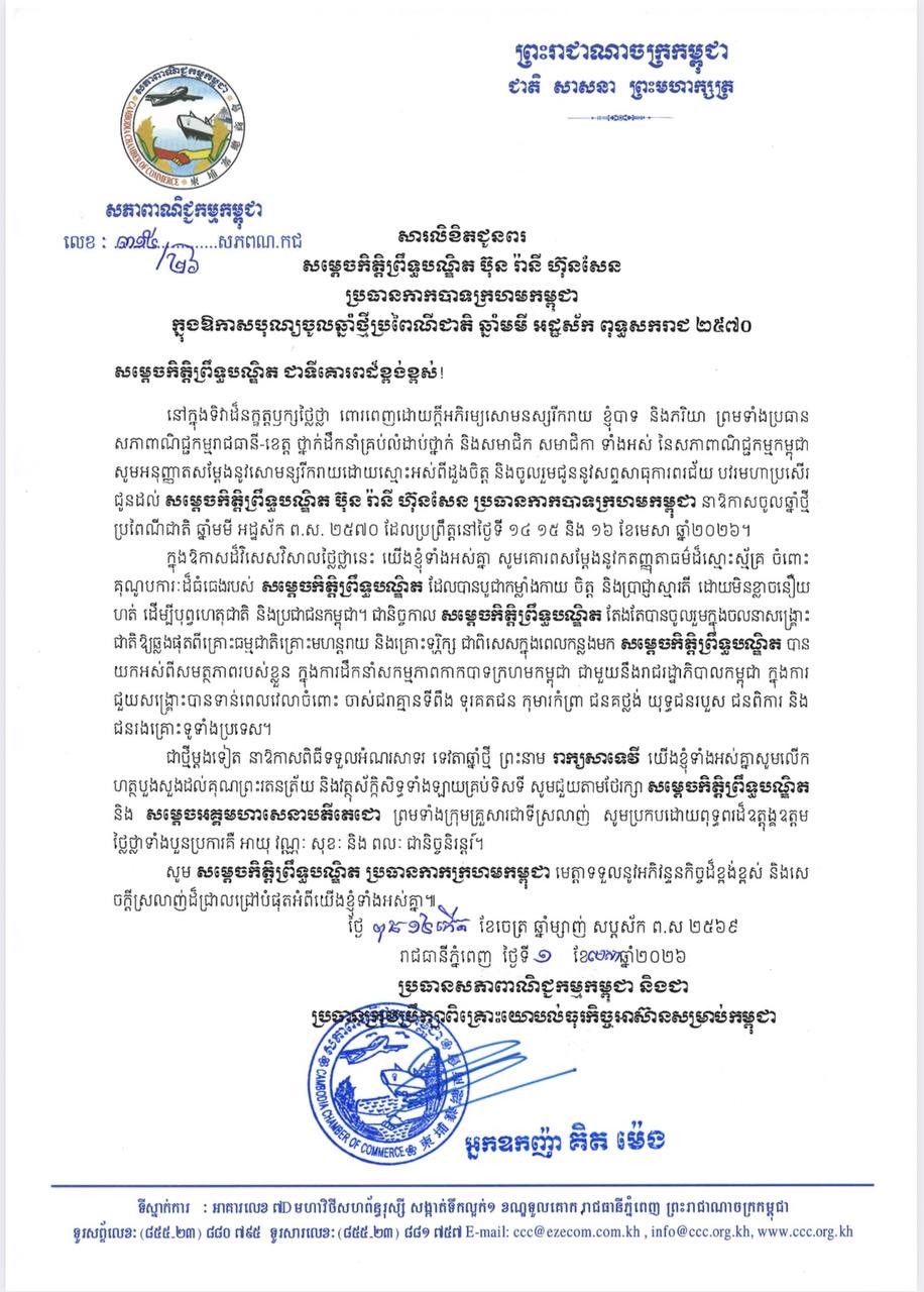 ក្នុងសារលិខិត អ្នកឧកញ៉ា គិត ម៉េង បានលើកឡើងថា “នៅក្នុងទិវាដ៏នក្ខត្តឫក្សថ្លៃថ្លា ពោរពេញដោយក្តីអភិរម្យសោមនស្សរីករាយ ខ្ញុំបាទ និងភរិយា ព្រមទាំងប្រធាន សភាពាណិជ្ជកម្មរាជធានី-ខេត្ត ថ្នាក់ដឹកនាំគ្រប់លំដាប់ថ្នាក់ និងសមាជិក សមាជិកា ទាំងអស់ នៃសភាពាណិជ្ជកម្មកម្ពុជា សូមអនុញ្ញាតសម្តែងនូវសោមន្សរីករាយដោយស្មោះអស់ពីដួងចិត្ត និងចូលរួមជូននូវសព្ទសាធុការពរជ័យ បវរមហាប្រសើរ ជូនដល់ សម្តេចកិត្តិព្រឹទ្ធបណ្ឌិត ប៊ុន រ៉ានី ហ៊ុនសែន ប្រធានកាកបាទក្រហមកម្ពុជា នាឱកាសចូលឆ្នាំថ្មី ប្រពៃណីជាតិ ឆ្នាំមមី អដ្ឋស័ក ព.ស. ២៥៧០ ដែលប្រព្រឹត្តនៅថ្ងៃទី ១៤ ១៥ និង ១៦ ខែមេសា ឆ្នាំ២០២៦។
