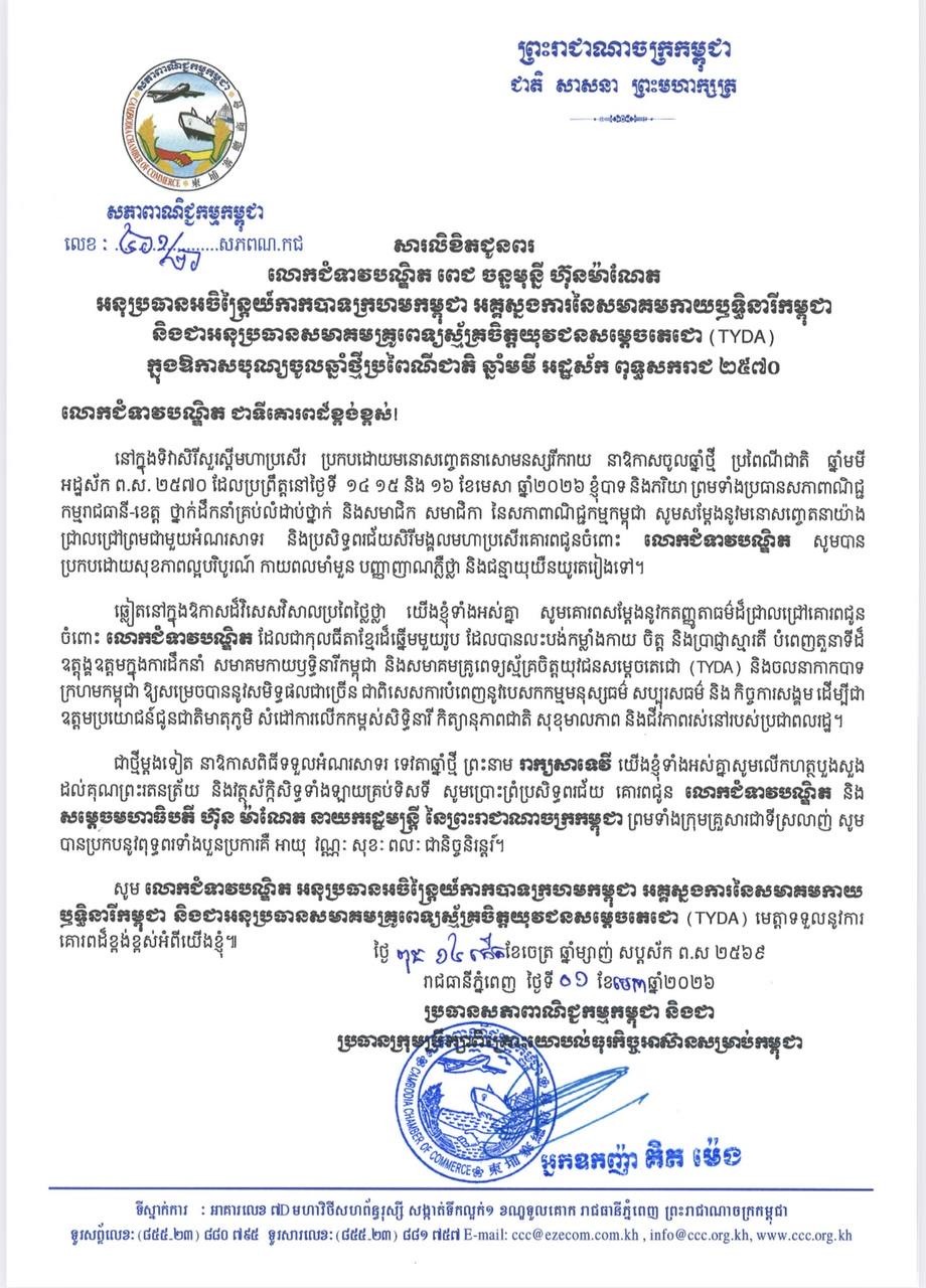 ក្នុងសារលិខិត អ្នកឧកញ៉ា គិត ម៉េង បានលើកឡើងថា “នៅក្នុងទិវាសិរីសួរស្តីមហាប្រសើរ ប្រកបដោយមនោសញ្ចេតនាសោមនស្សរីករាយ នាឱកាសចូលឆ្នាំថ្មី ប្រពៃណីជាតិ ឆ្នាំមមី អដ្ឋស័ក ព.ស. ២៥៧០ ដែលប្រព្រឹត្តនៅថ្ងៃទី ១៤ ១៥ និង ១៦ ខែមេសា ឆ្នាំ២០២៦ ខ្ញុំបាទ និងភរិយា ព្រមទាំងប្រធានសភាពាណិជ្ជកម្មរាជធានី-ខេត្ត ថ្នាក់ដឹកនាំគ្រប់លំដាប់ថ្នាក់ និងសមាជិក សមាជិកា នៃសភាពាណិជ្ជកម្មកម្ពុជា សូមសម្តែងនូវមនោសញ្ចេតនាយ៉ាងជ្រាលជ្រៅព្រមជាមួយអំណរសាទរ និងប្រសិទ្ធពរជ័យសិរីមង្គលមហាប្រសើរគោរពជូនចំពោះលោកជំទាវបណ្ឌិត សូមបានប្រកបដោយសុខភាពល្អបរិបូរណ៍ កាយពលមាំមួន បញ្ញាញាណភ្លឺថ្លា និងជន្មាយុយឺនយូរតរៀងទៅ។