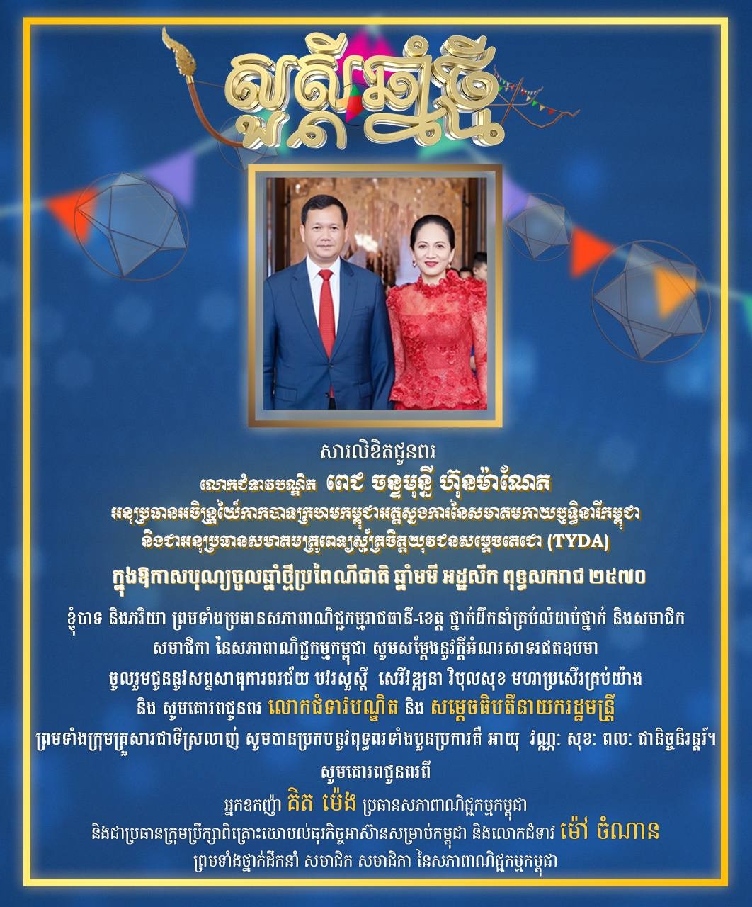 អ្នកឧកញ៉ា គិត ម៉េង និងលោកជំទាវ អ្នកឧកញ៉ា ម៉ៅ ចំណាន គិតម៉េង ផ្ញើសារលិខិតជូនពរជូនពរលោកជំទាវបណ្ឌិត ពេជ ចន្ទមុន្នី ហ៊ុនម៉ាណែត អនុប្រធានអចិន្ត្រៃយ៍កាកបាទក្រហមកម្ពុជា ក្នុងឱកាសបុណ្យចូលឆ្នាំថ្មីប្រពៃណីជាតិ
