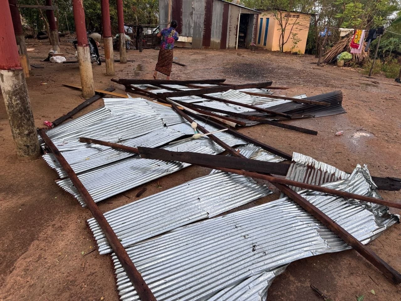 ត្បូងឃ្មុំ៖ ភ្លៀងកក់ខែមួយមេធំ លាយឡំខ្យល់កន្ត្រាក់ បណ្ដាលឲ្យរំលំផ្ទះប្រជាពលរដ្ឋមួយខ្នង រាបដល់ដី នៅសល់តែជើងសសរ និងជណ្ដើរ ខណៈប៉ើងដំបូល ២៤ខ្នងផ្ទះ កាលពីថ្ងៃទី១៥ ខែមេសា ឆ្នាំ២០២៦ ជាថ្ងៃចូលឆ្នាំទី២ វេលាម៉ោងប្រម៉ាណជា ១៥ ទៅម៉ោង ១៦រសៀល ស្ថិតនៅភូមិកន្លែងចក ឃុំមៀន ស្រុកអូរាំងឪ ខេត្តត្បូងឃ្មុំ។