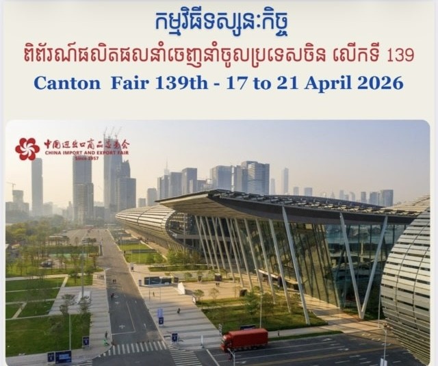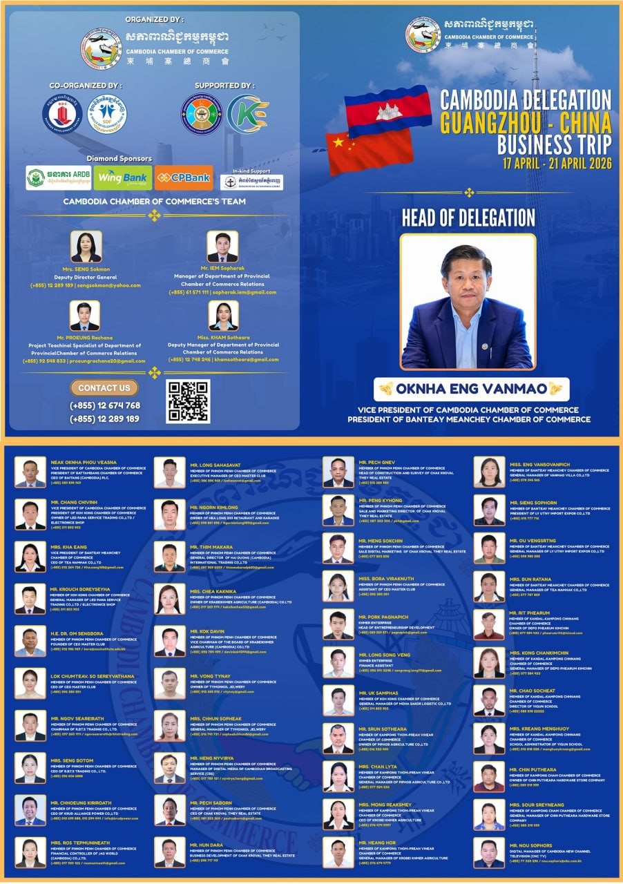 ភ្នំពេញ៖ ដោយទទួលបានការអនុញ្ញាតពីអ្នកឧកញ៉ា គិត ម៉េង ប្រធានសភាពាណិជ្ជកម្មកម្ពុជា និងជាប្រធានក្រុមប្រឹក្សាពិគ្រោះយោបល់ធុរកិច្ចអាស៊ានសម្រាប់កម្ពុជា នាព្រឹកថ្ងៃទី១៧ ខែមេសា ឆ្នាំ២០២៦ ឧកញ៉ា អ៊ឹង វណ្ណម៉ៅ អនុប្រធានសភាពាណិជ្ជកម្មកម្ពុជា និងជាប្រធានសភាពាណិជ្ជកម្មខេត្តបន្ទាយមានជ័យ បានដឹកនាំគណៈប្រតិភូសភាពាណិជ្ជកម្មកម្ពុជា ចំនួន ៤៨រូប បំពេញទស្សនកិច្ចពាណិជ្ជកម្មទៅកាន់ទីក្រុងក្វាងចូវ នៃសាធារណរដ្ឋប្រជាមានិតចិន ចាប់ពីថ្ងៃទី១៧ ដល់ថ្ងទី២១ ខែមេសា ឆ្នាំ២០២៦។