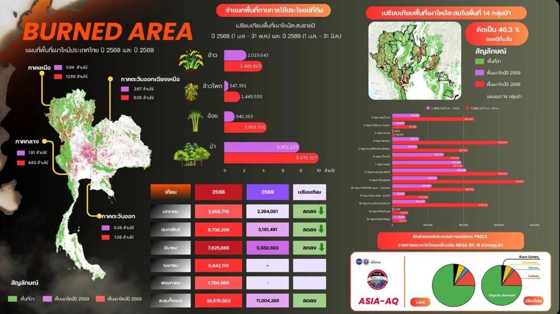 ការកើនឡើងចំនួននៃទីតាំងដែលមានភ្លើងឆេះព្រៃជិត ៥០% ក្នុងរយៈពេល ៤ ខែដំបូងនៃឆ្នាំ ២០២៦ បានបង្កឱ្យមានក្ដីបារម្ភយ៉ាងខ្លាំងពីបញ្ហាភ្លើងឆេះព្រៃ និងខ្យល់កខ្វក់ PM2.5។ តួលេខនៃការកើនឡើងនេះ បានជំរុញឱ្យអាជ្ញាធរថៃ ត្រូវចាត់វិធានការណ៍ជាបន្ទាន់ ដើម្បីតាមដាន និងទប់ស្កាត់ ។