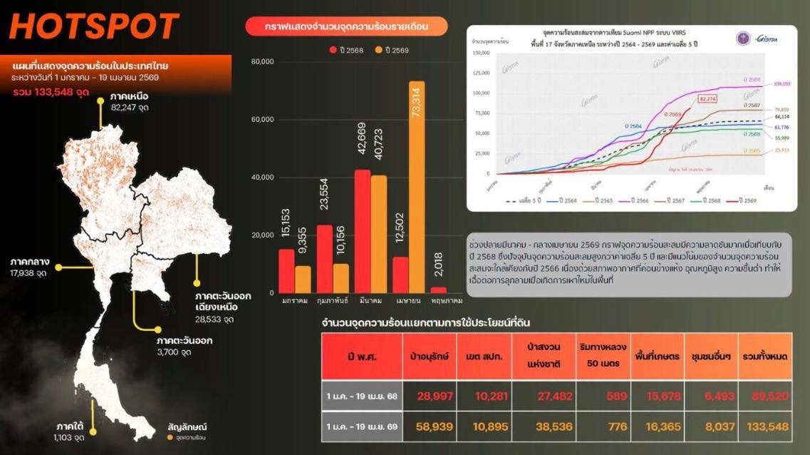 ថៃឡង់ដ៍៖ យោងតាមទិន្នន័យផ្កាយរណបពីភ្នាក់ងារអភិវឌ្ឍន៍បច្ចេកវិទ្យាអវកាស និងព័ត៌មានវិទ្យាភូមិសាស្ត្រ ហៅកាត់ថា GISTDA របស់ប្រទេសថៃ បានកត់ត្រាចំនួននៃទីតាំងដែលមានភ្លើងឆេះព្រៃសរុប ១៣៣,៥៤៨ កន្លែង ចាប់ពីថ្ងៃទី ១ មករា ដល់ ១៩ មេសា ២០២៦ ដែលកើនឡើងជិត ៥០% បើធៀបនឹងរយៈពេលដូចគ្នាកាលពីឆ្នាំ ២០២៥ ដែលមានត្រឹម ៨៩,៥២០ កន្លែង ។