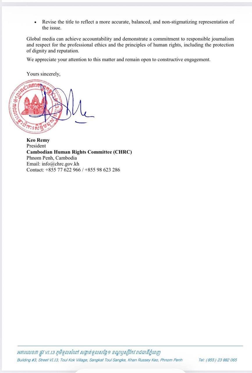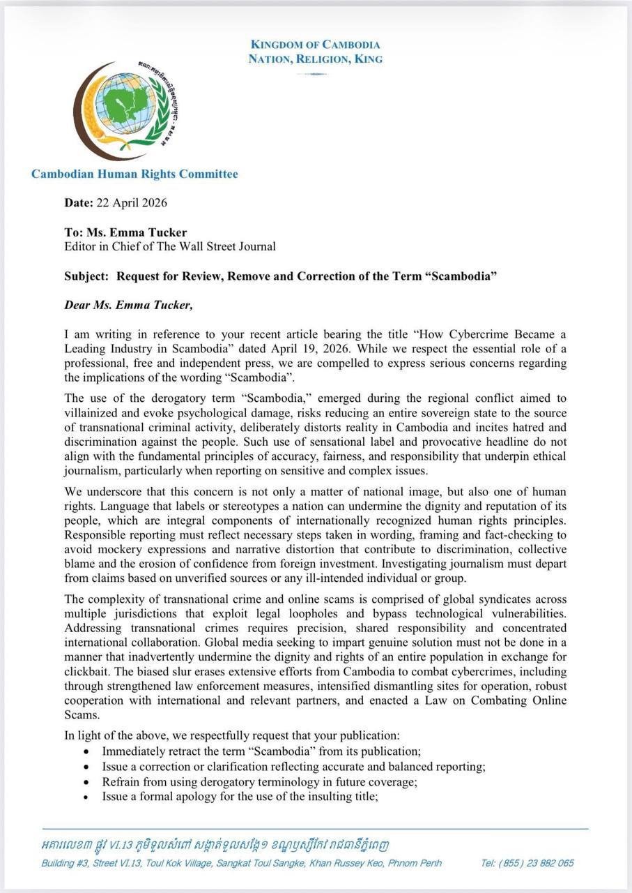 គណ:កម្មាធិការសិទ្ធិមនុស្សកម្ពុជា ផ្ញើលិខិតទៅសារព័ត៌មាន The Wall Street Journal ឱ្យលុបពាក្យ “Scambodia” ចេញពីអត្ថបទរបស់ខ្លួនជាបន្ទាន់