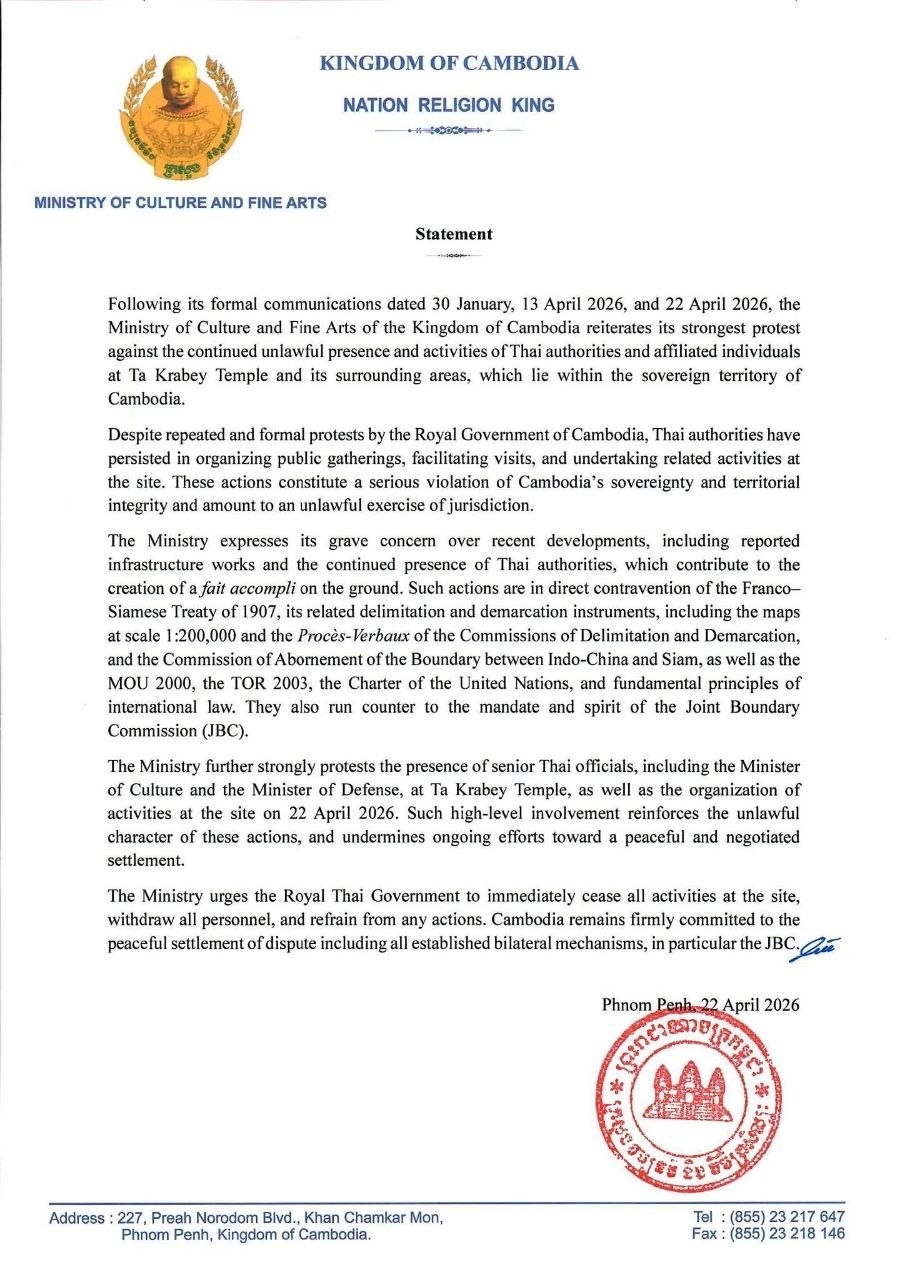 ភ្នំពេញ៖ សេចក្តីថ្លែងការណ៍ក្រសួងវប្បធម៌ និងវិចិត្តសិល្បៈ បានលើកឡើងថា ស្របតាមលិខិតផ្លូវការ ចុះថ្ងៃទី៣០ ខែមករា ឆ្នាំ២០២៦ និងថ្ងៃទី១៣ ខែមេសា ឆ្នាំ២០២៦ ព្រមទាំងថ្ងៃទី២២ ខែមេសា ឆ្នាំ២០២៦ ក្រសួងវប្បធម៌ និងវិចិត្រសិល្បៈ សូមបន្តធ្វើការតវ៉ាយ៉ាងខ្លាំងខ្លាបំផុត ចំពោះវត្តមាន និងការបន្តបង្កសកម្មភាពខុសច្បាប់របស់អាជ្ញាធរថៃ នៅប្រាសាទតាក្របី និងតំបន់ជុំវិញ ដែលជាទីតាំងស្ថិតនៅក្នុងដែនអធិបតេយ្យភាពរបស់កម្ពុជា។
