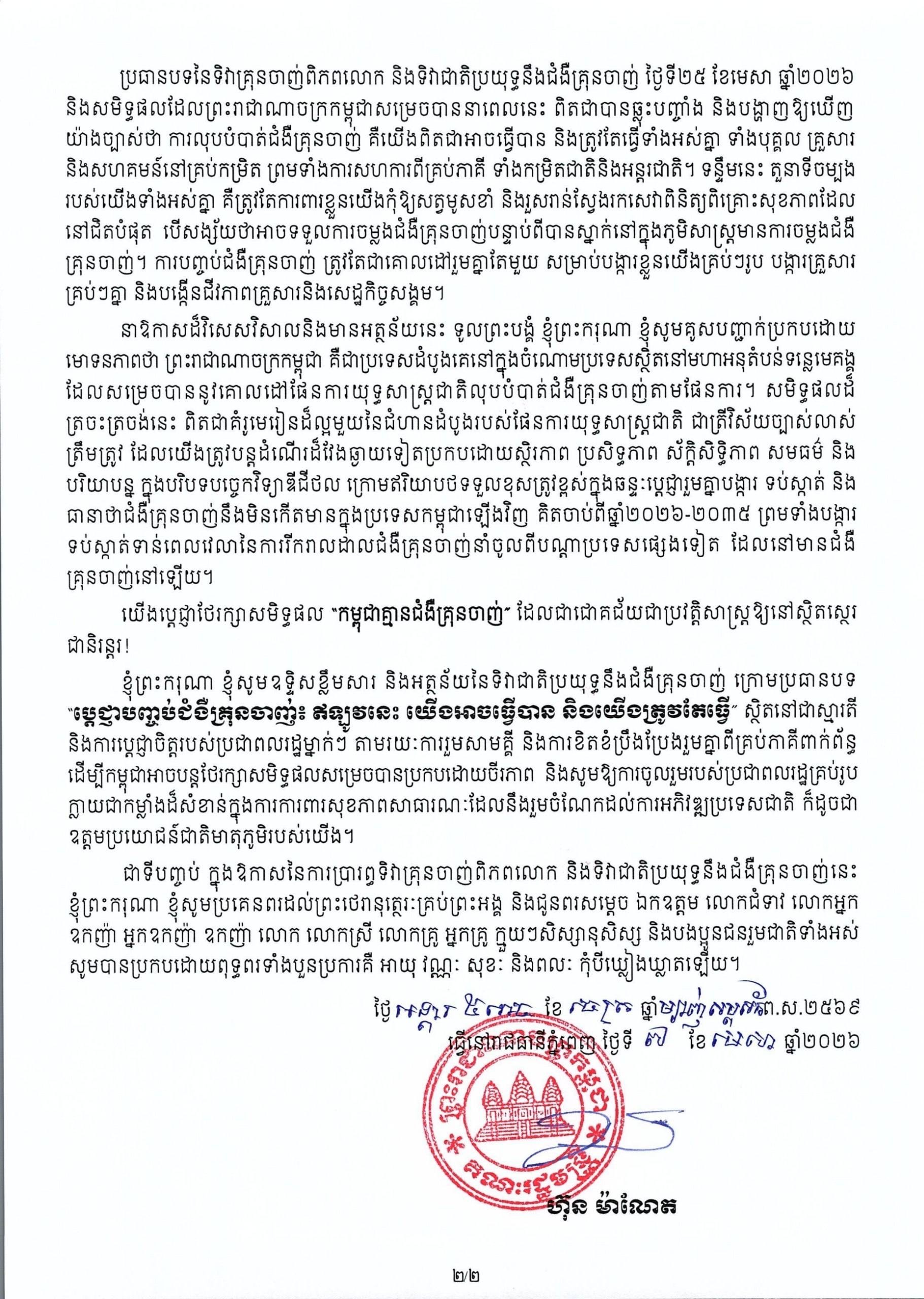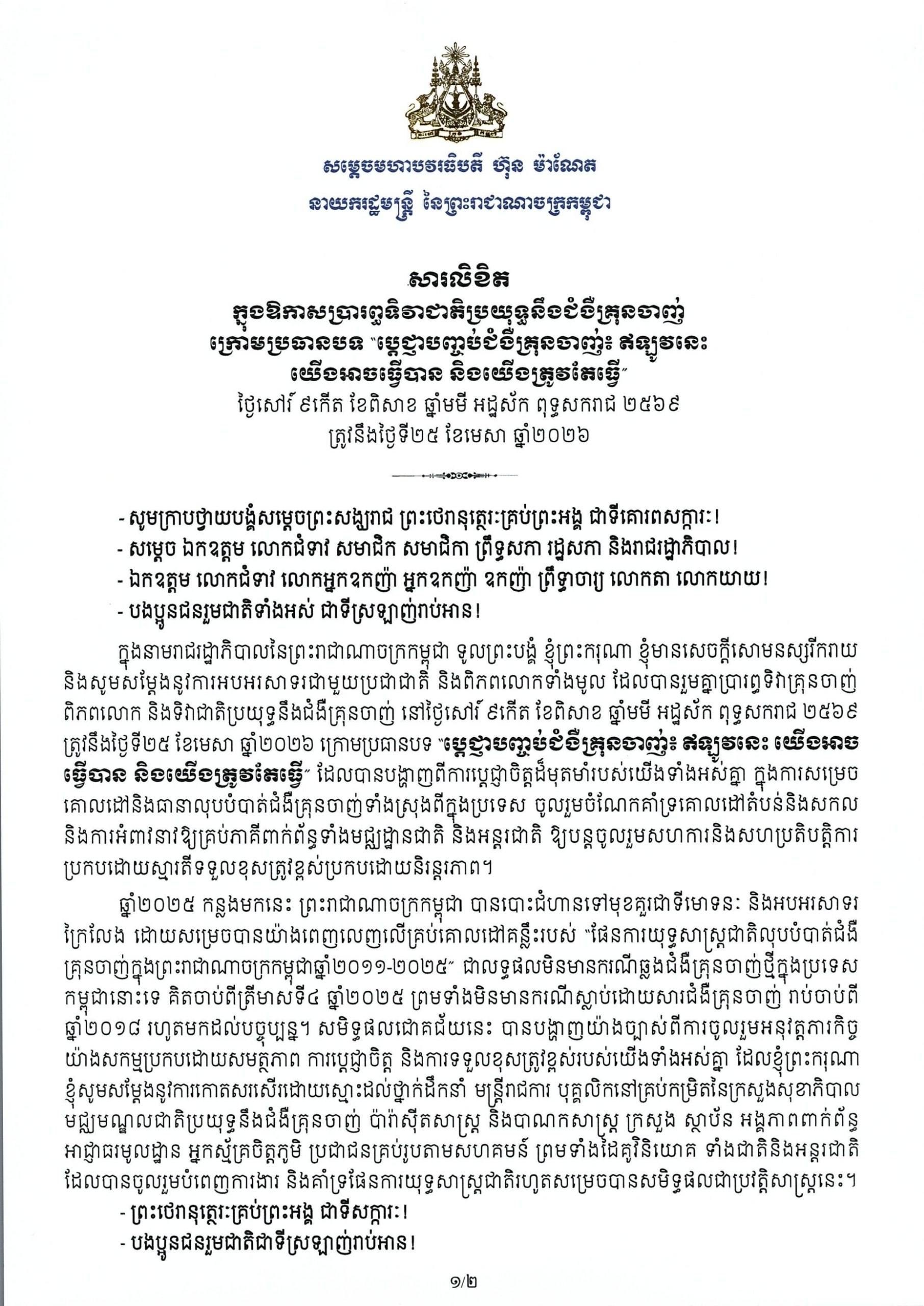 តាមរយៈសារលិខិត សម្តេចបវរធិបតី បានបញ្ជាក់ថា "ប្រធានបទនៃទិវាគ្រុនចាញ់ពិភពលោក និងទិវាជាតិប្រយុទ្ធនឹងជំងឺគ្រុនចាញ់ ថ្ងៃទី២៥ ខែមេសា ឆ្នាំ២០២៦ និងសមិទ្ធផលដែលព្រះរាជាណាចក្រកម្ពុជាសម្រេចបាននាពេលនេះ ពិតជាបានឆ្លុះបញ្ចាំង និងបង្ហាញឱ្យឃើញ យ៉ាងច្បាស់ថា ការលុបបំបាត់ជំងឺគ្រុនចាញ់ គឺយើងពិតជាអាចធ្វើបាន និងត្រូវតែធ្វើទាំងអស់គ្នា ទាំងបុគ្គល គ្រួសារ និងសហគមន៍នៅគ្រប់កម្រិត ព្រមទាំងការសហការពីគ្រប់ភាគី ទាំងកម្រិតជាតិនិងអន្តរជាតិ។ ទន្ទឹមនេះ តួនាទីចម្បង របស់យើងទាំងអស់គ្នា គឺត្រូវតែការពារខ្លួនយើងកុំឱ្យសត្វមូសខាំ និងរួសរាន់ស្វែងរកសេវាពិនិត្យពិគ្រោះសុខភាពដែល នៅជិតបំផុត បើសង្ស័យថាអាចទទួលការចម្លងជំងឺគ្រុនចាញ់បន្ទាប់ពីបានស្នាក់នៅក្នុងភូមិសាស្ត្រមានការចម្លងជំងឺ គ្រុនចាញ់។ ការបញ្ចប់ជំងឺគ្រុនចាញ់ ត្រូវតែជាគោលដៅរួមគ្នាតែមួយ សម្រាប់បង្ការខ្លួនយើងគ្រប់ៗរូប បង្ការគ្រួសារ គ្រប់ៗគ្នា និងបង្កើនជីវភាពគ្រួសារនិងសេដ្ឋកិច្ចសង្គម"៕