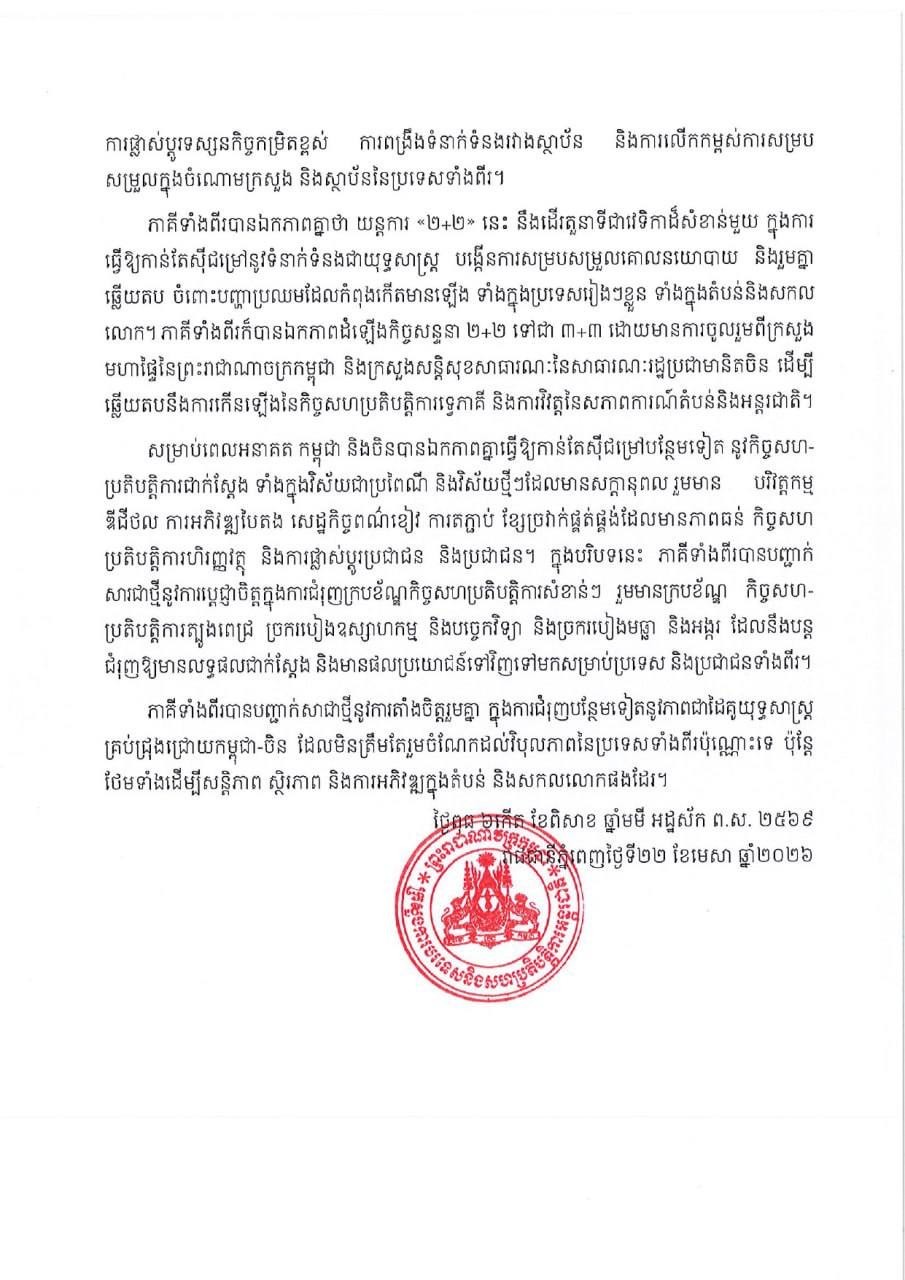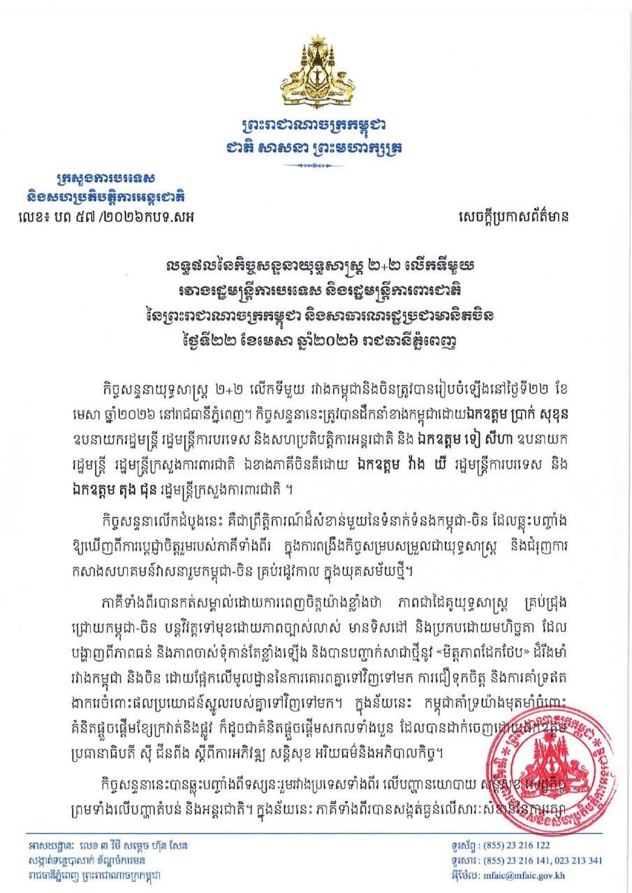 នេះបើយោងតាមសេចក្តីប្រកាសព័ត៌មាន របស់ក្រសួងការបរទេស និងសហប្រតិបត្តិការអន្តរជាតិ ស្តីពីលទ្ធផលនៃកិច្ចសន្ទនាយុទ្ធសាស្ត្រ ២+២ លើកទីមួយ រវាងរដ្ឋមន្ត្រីការបរទេស និងរដ្ឋមន្ត្រីការពារជាតិ នៃព្រះរាជាណាចក្រកម្ពុជា និងសាធារណរដ្ឋប្រជាមានិតចិន នៅថ្ងៃទី២២ ខែមេសា ឆ្នាំ២០២៦ នារាជធានីភ្នំពេញ។