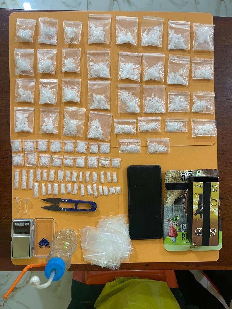 សរុបវត្ថុតាងដកហូតរួមមាន៖ ម្ស៉ៅក្រាមពណ៌សថ្លា ៨០កញ្ចប់, ទូរស័ព្ទដៃ ០១គ្រឿង និងសម្ភារប្រើប្រាស់វេចខ្ចប់មួយចំនួនទៀត។