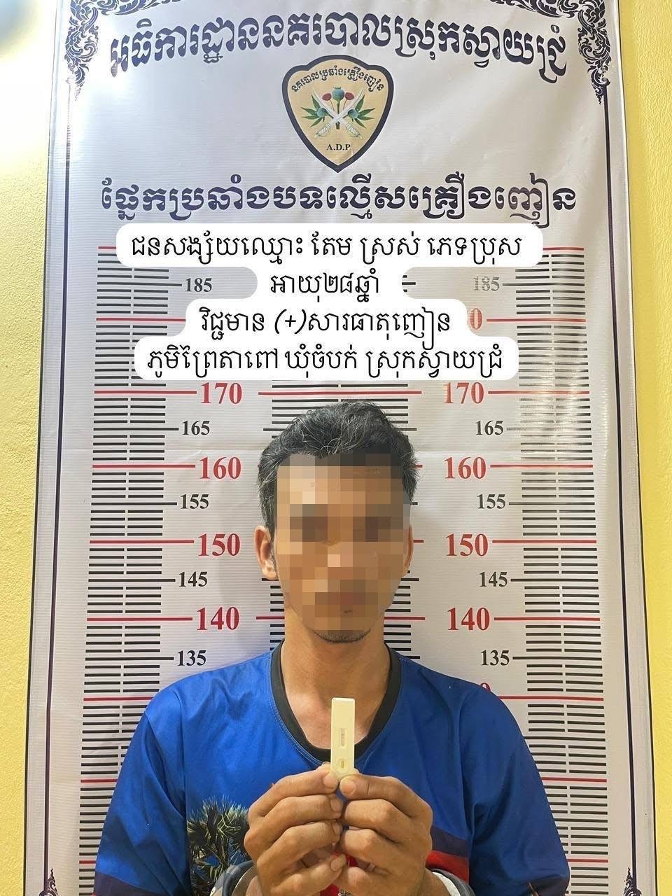 សមត្ថកិច្ចស្រុកស្វាយជ្រំ ឃាត់ខ្លួនជនសង្ស័យម្នាក់ រួមនឹងម្ស៉ៅក្រាមពណ៌សថ្លា៨០កញ្ចប់ ពាក់ព័ន្ធករណីជួញដូរគ្រឿងញៀនខុសច្បាប់