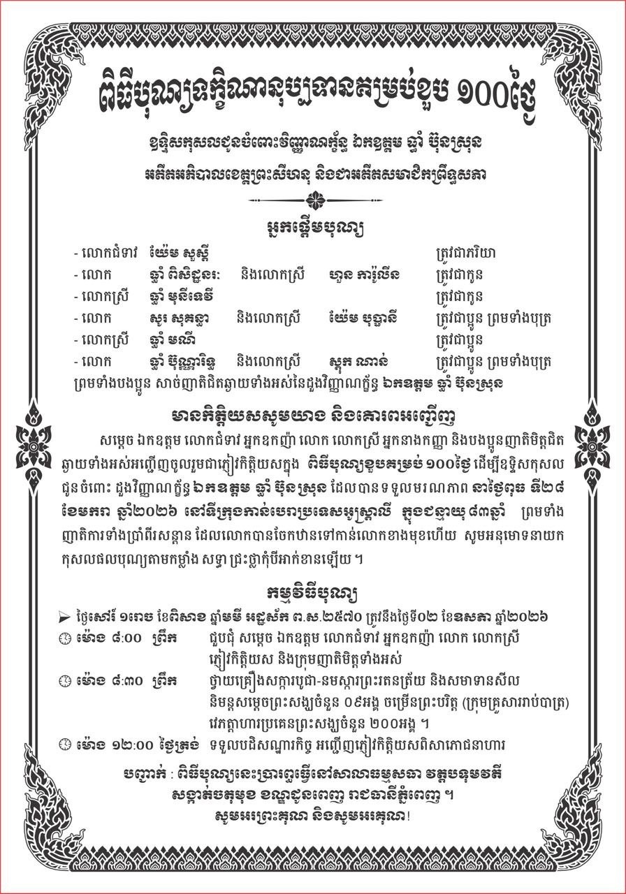 សូមបញ្ជាក់ថា ឯកឧត្តម ធ្ធាំ ប៊ុនស្រុន បានទទួលមរណភាព នាថ្ងៃពុធ ទី២៨ ខែមករា ឆ្នាំ២០២៦ នៅទីក្រុងកាន់បេរាប្រទេសអូស្ត្រាលី ក្នុងជន្មាយុ ៨៣ឆ្នាំ។ ពិធីបុណ្យខួបគម្រប់ ១០០ថ្ងៃ ដើម្បីឧទ្ទិសកុសលជូនចំពោះដួងវិញ្ញាណក្ខ័ន្ធ ឯកឧត្តម ធ្ធាំ ប៊ុនស្រុន នឹងប្រព្រឹត្តទៅ នៅថ្ងៃសៅរ៍ ១រោច ខែពិសាខ ឆ្នាំមមី អដ្ឋស័ក ព.ស.២៥៧០ ត្រូវនឹងថ្ងៃទី០២ ខែឧសភា ឆ្នាំ២០២៦ នាសាលាធម្មសភា វត្តបទុមវតី ខណ្ឌដូនពេញ៕