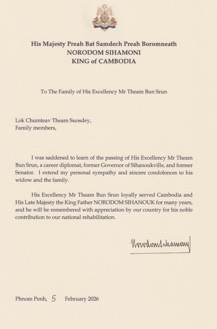 ព្រះមហាក្សត្រនៃព្រះរាជាណាចក្រកម្ពុជា បានផ្ញើរព្រះរាជសារលិខិតរំលែកទុក្ខជូនដល់គ្រួសារឯកឧត្តម ធ្ធាំ ប៊ុនស្រុន ដែលបានទទួលមរណភាព