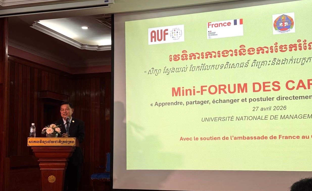 ភ្នំពេញ៖ សាកលវិទ្យាល័យជាតិគ្រប់គ្រង (NUM) បានរៀបចំវេទិកាការងារខ្នាតតូចលើកទី១ នៅថ្ងៃទី ២៧ ខែមេសា ដោយសហការជាមួយទីភ្នាក់ងារឧត្តមសិក្សាប្រើប្រាស់ភាសាបារាំង(AUF) និងសភាពាណិជ្ជកម្ម និងឧស្សាហកម្មបារាំង-កម្ពុជា (CCIFC)។