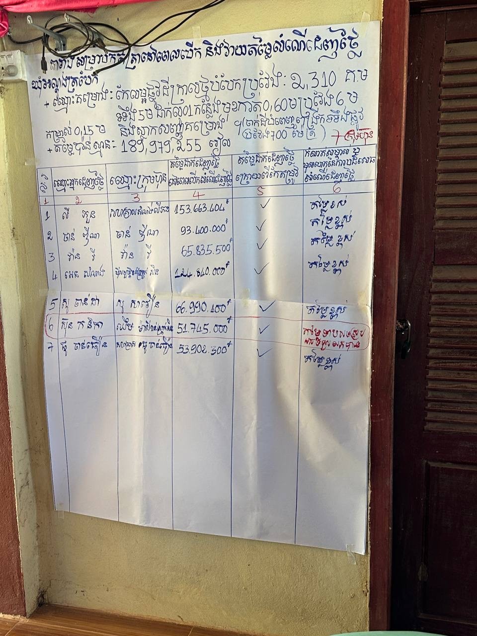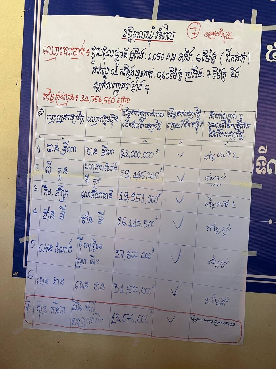 ទី៤-គម្រោងជួសជុលផ្លូវដី ១ខ្សែ ប្រវែង ១,០៥០ម៉ែត្រ តម្លៃប៉ាន់ស្មាន ៣៤,៧៥៦,៥៦០រៀល មានក្រុមហ៊ុនដាក់ដេញថ្លៃ ៧ក្រុមហ៊ុន។ ជាលទ្ធផល បានទៅក្រុមហ៊ុន ឈឹម ម៉ាលី ខន់ស្ត្រាក់សិន ដាក់តម្លៃ១២,០៧៦,០០០រៀល (តម្លៃទាបអាចទទួលយកបាន)។