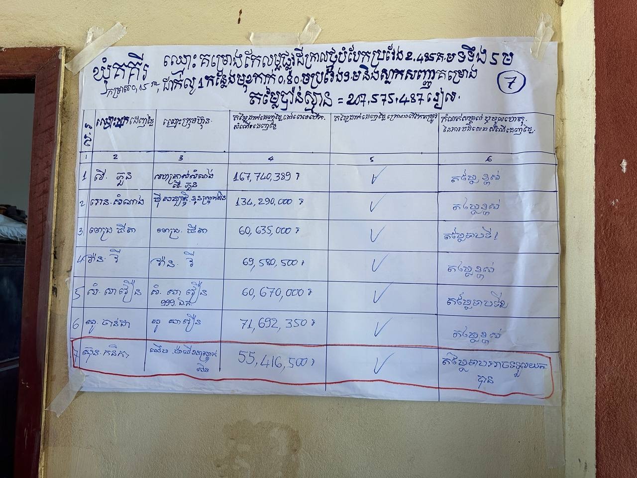 ស្វាយរៀង៖ គម្រោងកែលម្អផ្លូវក្រាលថ្មបំបែក ៣ខ្សែ និងផ្លូវដី ១ខ្សែ ត្រូវបានដាក់ឱ្យដេញថ្លៃជាផ្លូវការ នៅសាលាឃុំគគីរ ស្រុករមាសហែក ខណៈលទ្ធផល គឺបានទៅក្រុមហ៊ុន ដែលបានដាក់តម្លៃក្រោម ៣០ភាគរយ បង្កឱ្យមានការបារម្ភពីគុណភាពនៃការសាងសង់។